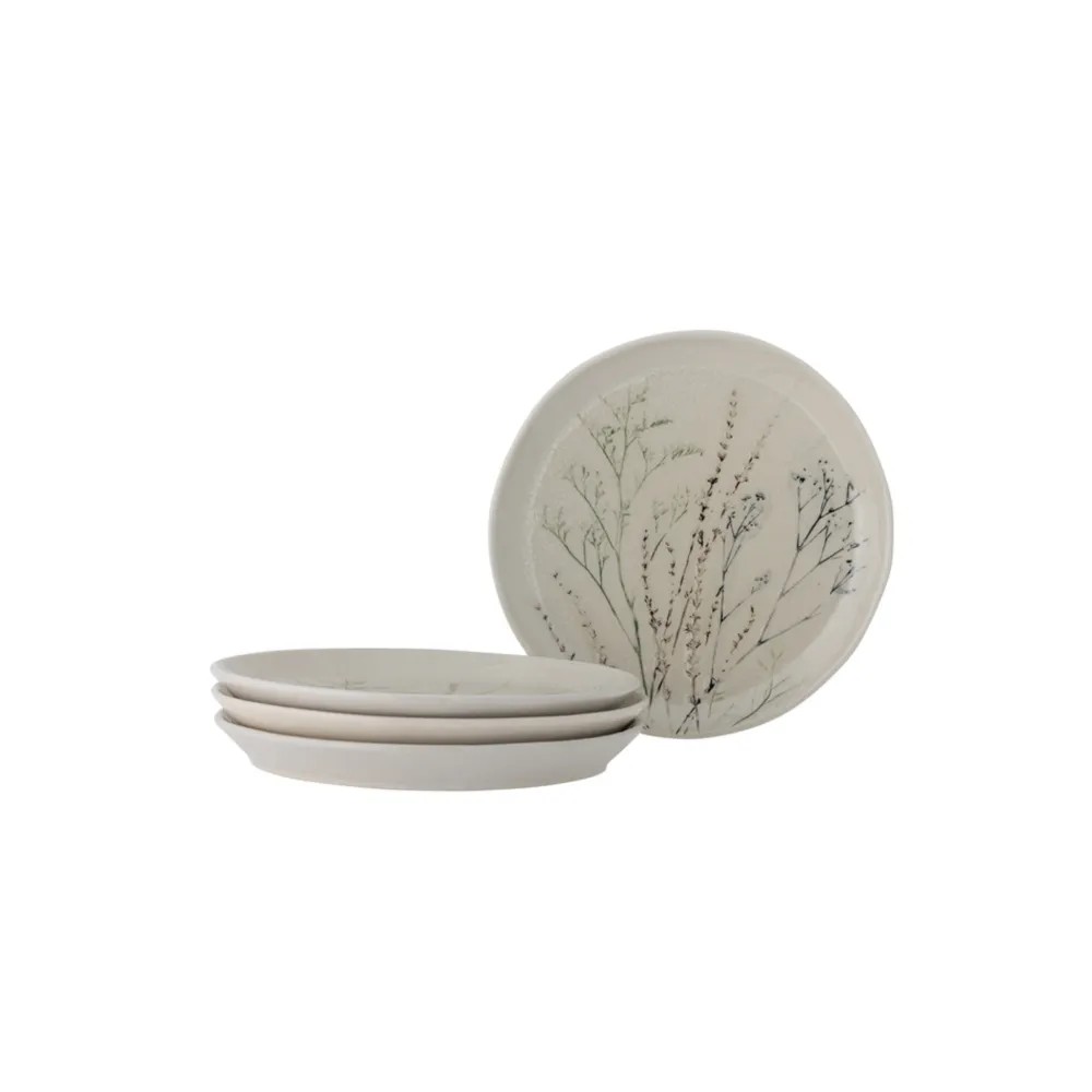 Bea Teller, Multipack, Natur, Steingut von Bloomingville aus Dänemark. Der Bea-Teller von Bloomingville ist ein wunderschöner Steingutteller in natürlichen Farben, mit einem zarten Blumenmotiv auf seiner Craquelé-Glasur. Der Teller ist handgefertigt, daher wird jedes Stück ein Unikat sein. Spülmaschinenfest. Packung mit 4. D27,5 cm.