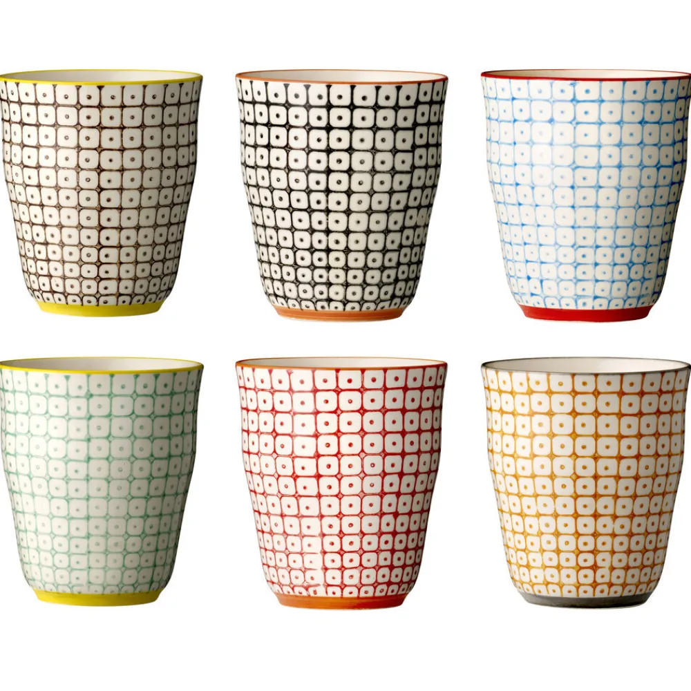 Carla Becher, Steingut von Bloomingville aus Dänemark. Die Becher Carla ohne Henkel von Bloomingville haben ein rustikales viereckiges Muster und sind in sechs Farben erhältlich. Die Kante an jedem Becher hat eine schöne Kontrastfarbe. Wählen Sie Ihren Favorit aus!