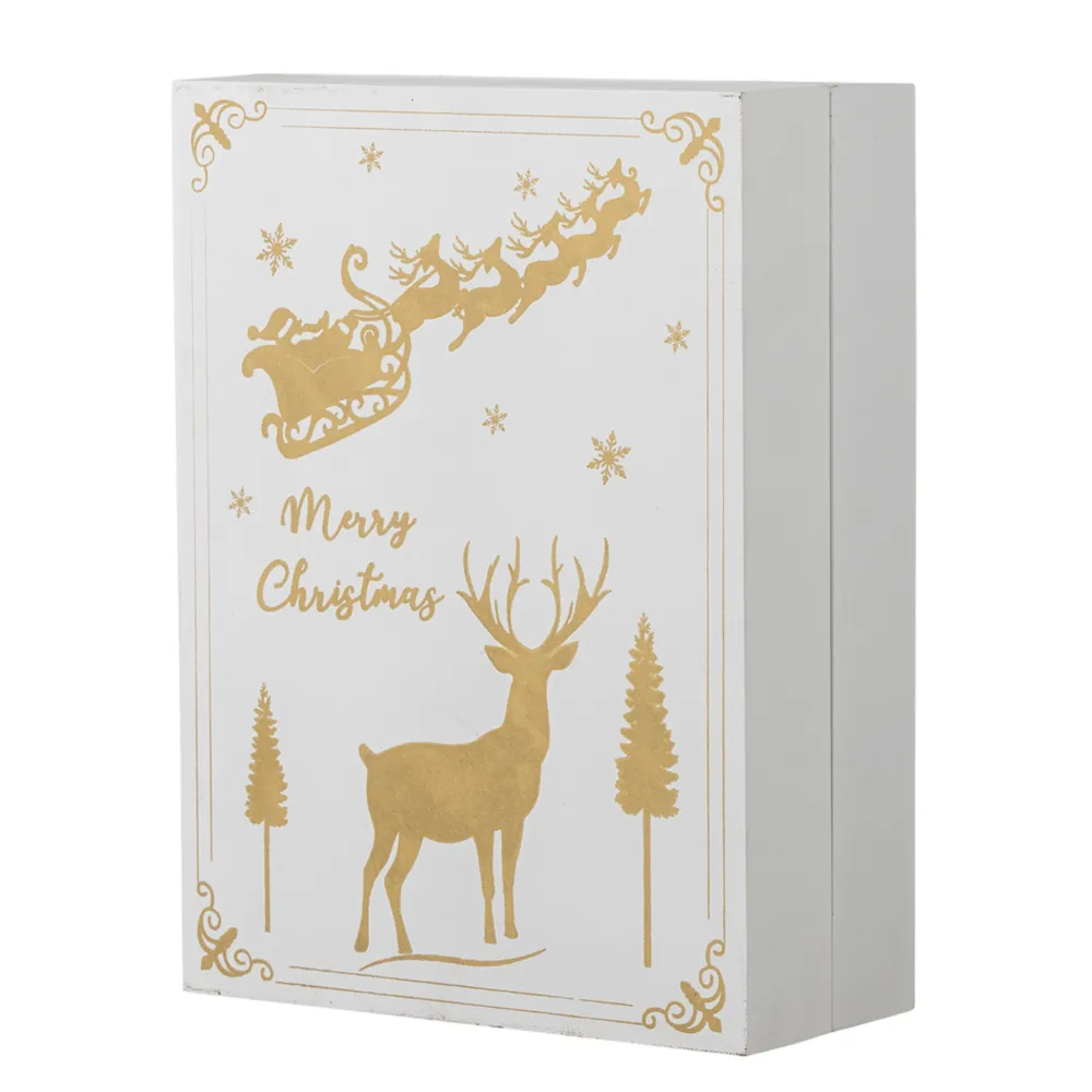 Elimar Adventskalender mit Licht von Bloomingville aus Dänemark. Der Elimar Kalender von Bloomingville ist als bezaubernde Winterszene gestaltet und mit detaillierten Schnitzereien geschmückt. Zusätzlich sind eingebaute Lichter vorhanden, die eine idyllische Kulisse für den Countdown bis Weihnachten schaffen. Der Kalender besteht aus 24 kleinen Schubladen, nummeriert von 1 bis 24, wobei jede Schublade mit eleganten Gold- und Weißmotiven verziert ist. Diese Schubladen bieten eine einzigartige Möglichkeit, Ihre Weihnachtstradition zu personalisieren, indem Sie selbst kleine Geschenke, Süßigkeiten oder Grüße hineinlegen – eines für jeden Tag bis Heiligabend.