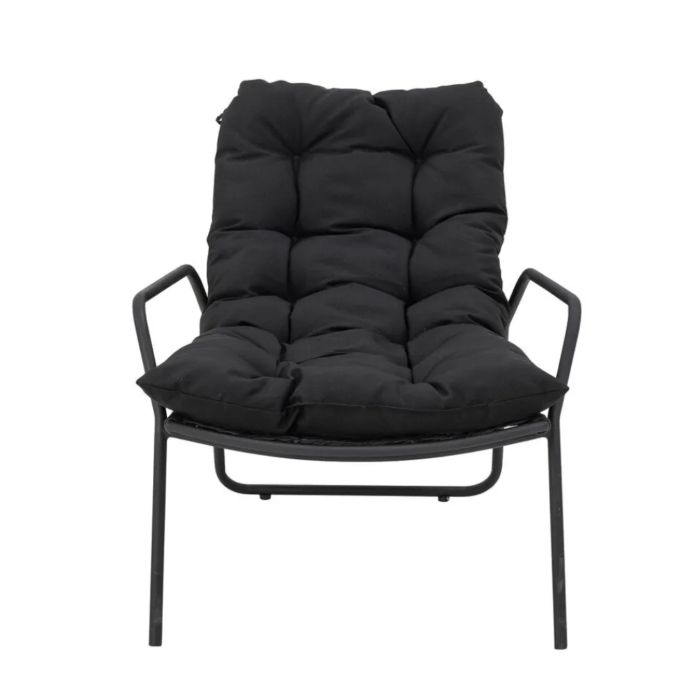 Garten Liegestuhl Boel, Schwarz, Metall von Bloomingville aus Dänemark. Der Liegestuhl Boel von Bloomingville ist ein absolutes Must-have im Garten oder auf der Terrasse. Der Liegestuhl ist äußerst bequem, ein weiches Kissen und ein Hocker sind inbegriffen. Der Rahmen des Liegestuhl ist aus schwarzem Metall gefertigt. Rückenlehne, Sitzfläche und Oberseite des Hocker sind aus geflochtenem Seil gefertigt.