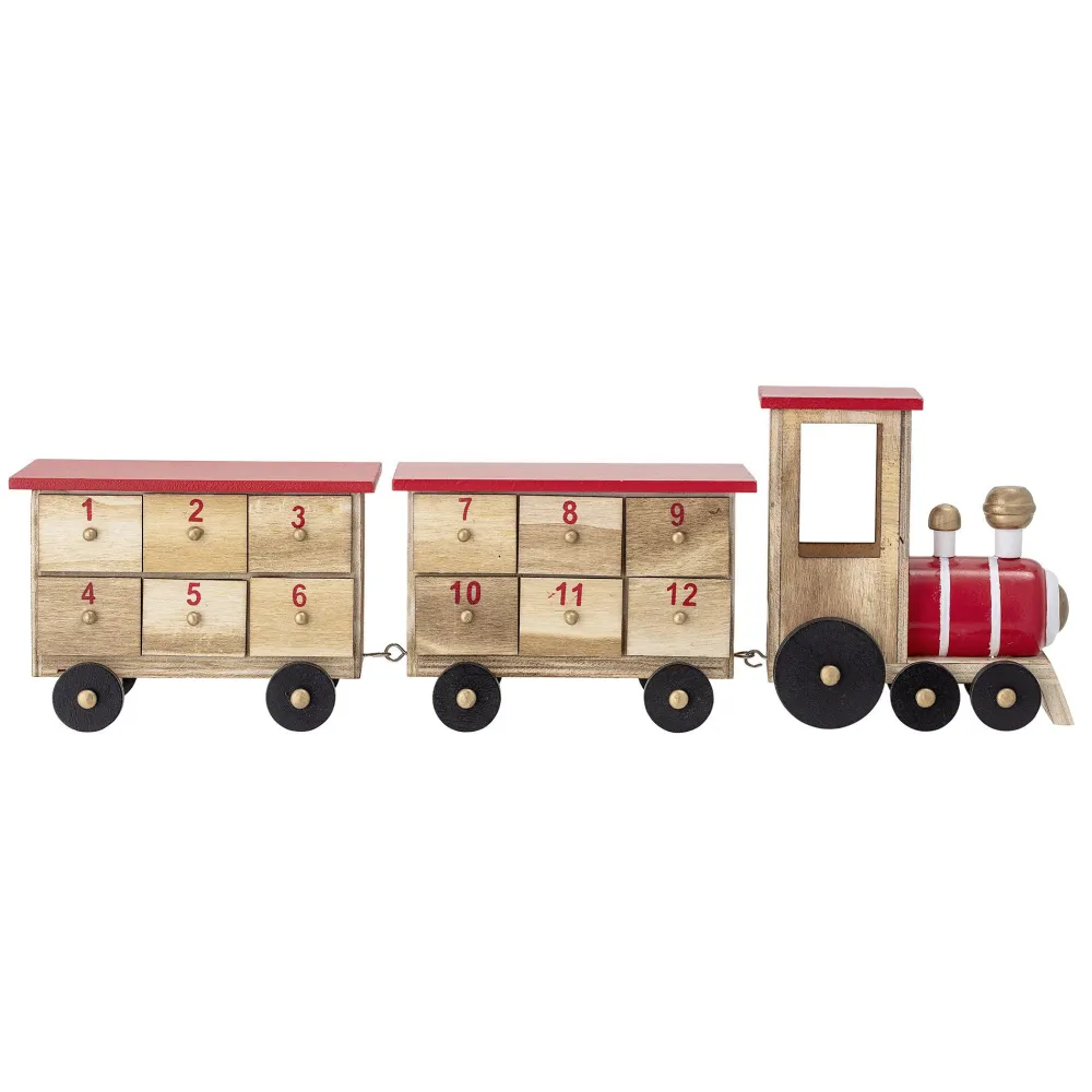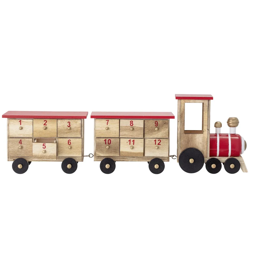 Der Kalender hat die Form eines Zuges und viele kleine, nummerierte Schubladen. Jede Schublade hat täglich Platz für eine Kleinigkeit vom 1. bis zum 24. Dezember.