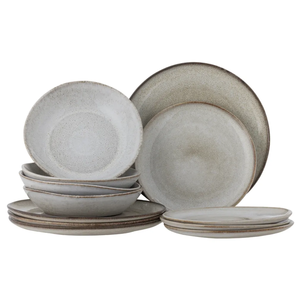 Das Set umfasst 4 x Sandrine Teller (D28,5 cm), 4 x Sandrine Teller (D22 cm) und 4 x Sandrine Schüsseln (D22xH5 cm).
