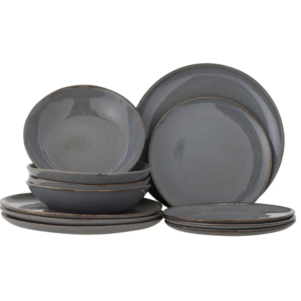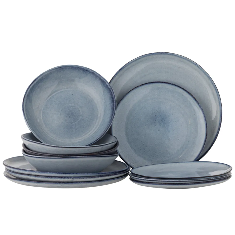 Sandrine Geschirrset aus Steingut von Bloomingville aus Dänemark. Das Sandrine Geschirrset von Bloomingville fügt jeder Tischdekoration mit seiner reichen, blauen Glasur und dunklen Rand eine farbenfrohe Note hinzu. Die Blautöne, hervorgehoben durch ein glänzendes Finish, verleihen dem handgefertigten Design Tiefe und Eleganz. Die Beschaffenheit der Glasur und die handgemachte Technik stellen sicher, dass jedes Produkt in der Serie einzigartig ist. Das Sandrine-Set ist eine stilvolle und praktische Ergänzung für den Esstisch, da es sowohl spülmaschinen- als auch mikrowellenfest ist.