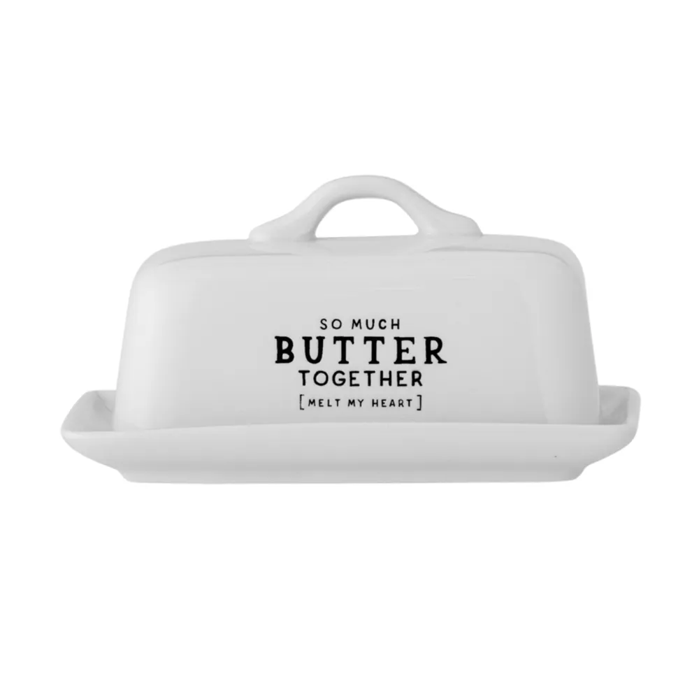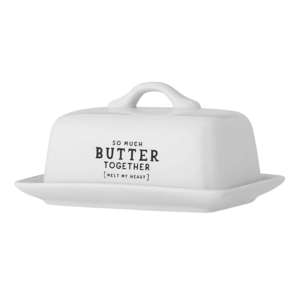 Wendy Butterdose, weiß, Steingut von Bloomingville aus Dänemark. Wendy Butterdose von Creative Collection mit dem Zitat „so much butter together (melt my heart)“ ist eine gemütliche und praktische Aufbewahrung für Butter. Die Butterdose ist mit einem Griff versehen, der das Anheben des Deckels und das Servieren der Butter auf dem Unterteller erleichtert. Das süße und lustige Design ist aus Steingut mit einer weißen Glasur und schwarzem Druck gefertigt.
