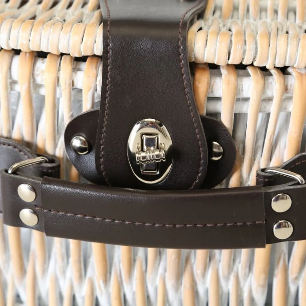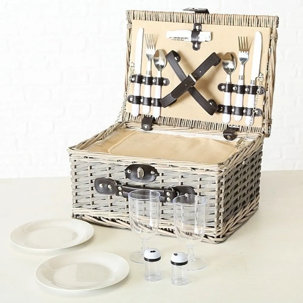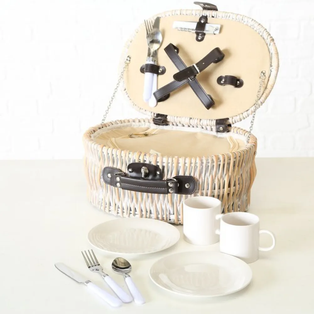 Dieser tolle Picknickkorb aus der Serie White Garden von BOLTZE verhilft dir und deinem Partner zu mehr Zweisamkeit. Ausgestattet mit einem kompletten Geschirr und Besteck Set für 2 Personen und einer Kühltasche könnt ihr eure liebsten Leckereien in diesen Korb legen und euch auf zu einem schönen Ort zum picknicken machen. Bei beiden Versionen ist größtenteils das gleiche Zubehör in leicht unterschiedlichem Design dabei. Der runde Korb beinhaltet zwei Becher, während der eckige zwei Wein bzw. Sekt Gläser vorweist und zusätzlich Salz und Pfeffer Streuer.