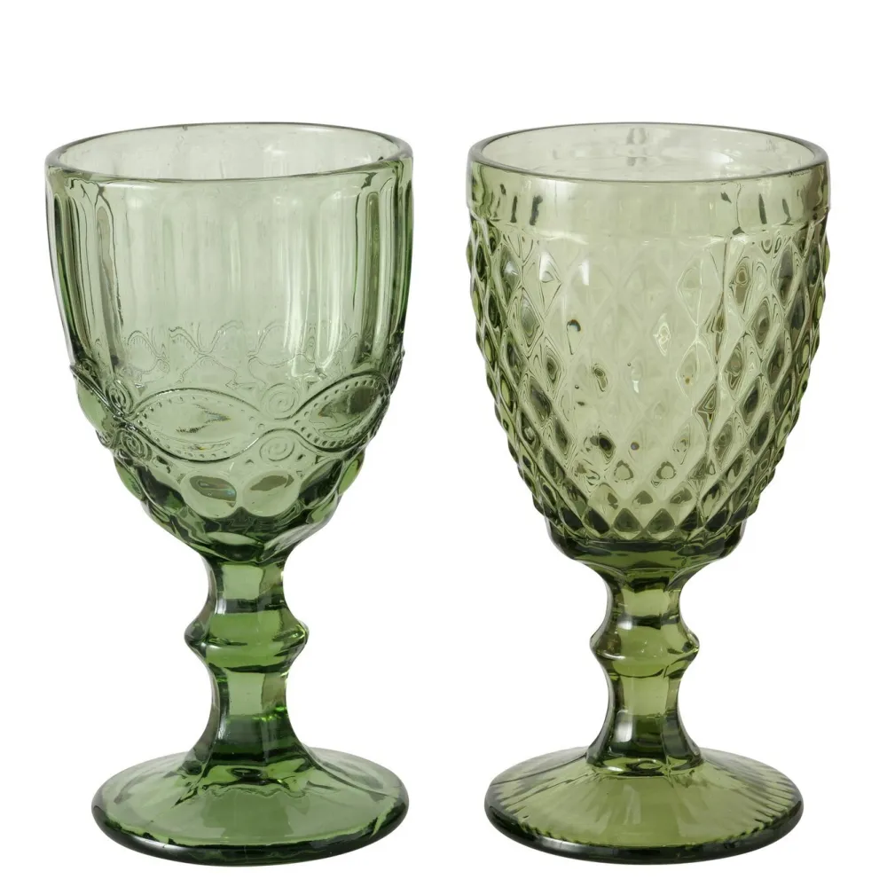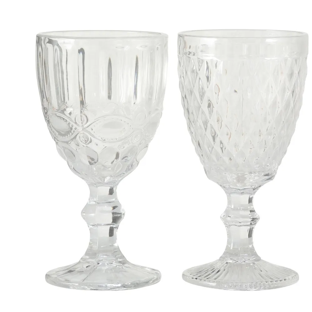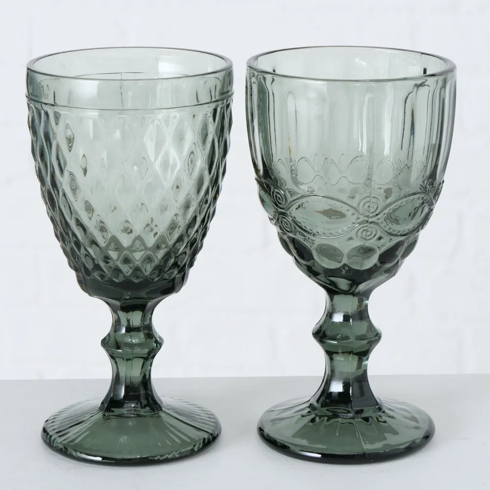 Der Stil dieser Weingläser erinnert an längst vergangene Zeiten und liegt dennoch absolut im Trend. Mit ihrem dekorativen Reliefmuster und ihrer klassischen Form liegt das Set absolut im Trend und sollten gerade deshalb auch nicht im Schrank verstauben. Das Design der Weingläser ist zeitlos schön und elegant. Die Füllmenge von einem Weinglas beträgt 300 ml.