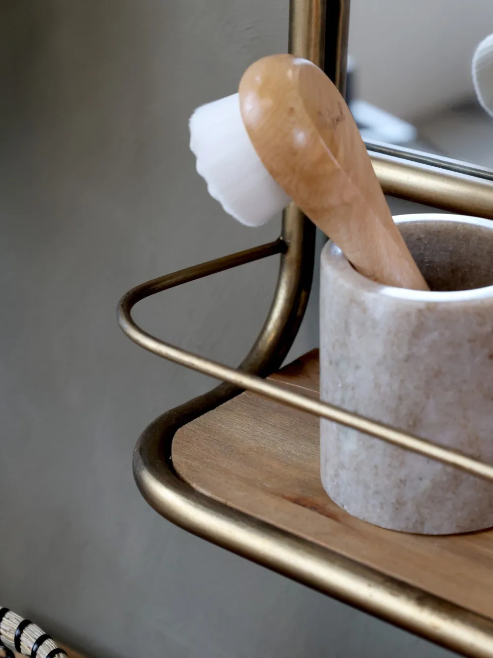 Das Regal ist aus Fichtenholz mit einem messingfarbenen Rahmen gefertigt. Platzieren Sie den Spiegel im Flur mit einer kleinen Vase und Blumen auf dem Regal, im Schlafzimmer mit Schmuck auf dem Regal oder im Badezimmer, wo Sie das Regal für Produkte oder eine duftende Kerze verwenden können.
