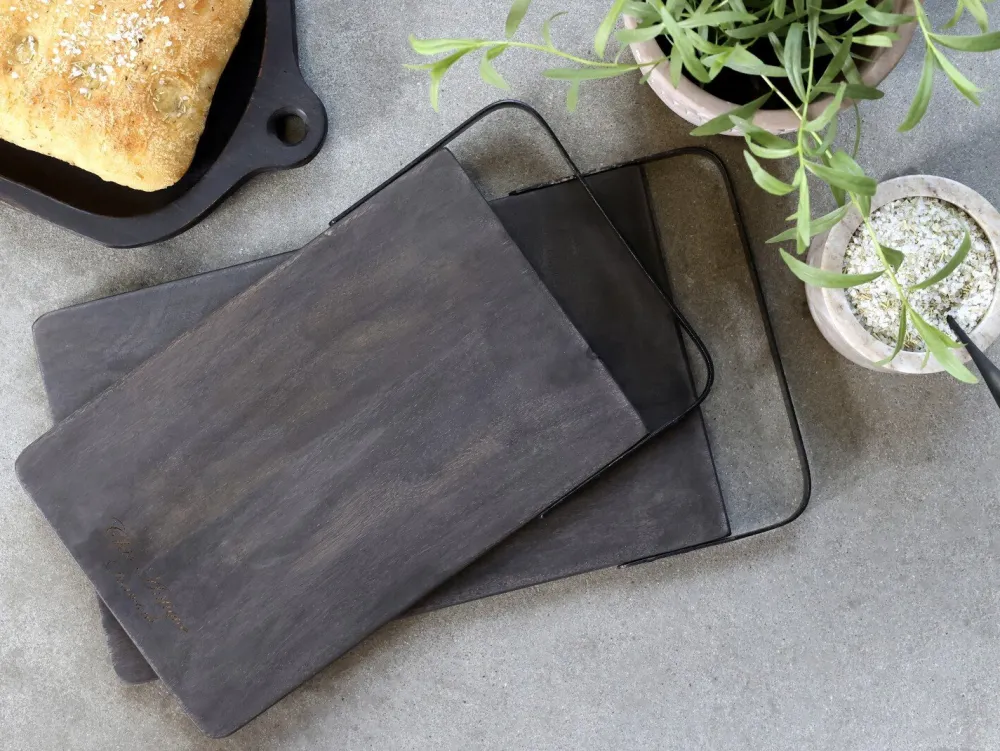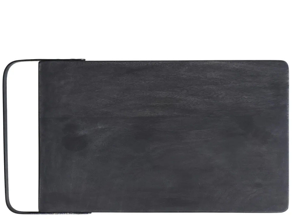 Tapasbrett von Chic Antique aus ihrer Laon-Serie. Das atemberaubende Brett besteht aus Mangoholz mit einer dunklen Holzlasur namens „Kohle“ und verfügt über ein exquisites Eisen-Detail mit einem eisernen Griff an einem Ende.