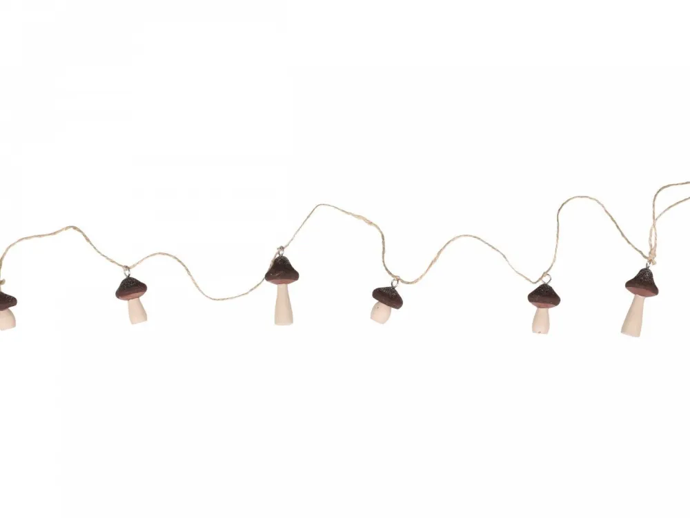 Die Girlande ist mit 6 Pilzen in der Farbe puder oder mokka bestückt, welche einen Hut aus Velours tragen. Ansonsten bestehen die dekorativen Pilze aus Holz und hängen an einer Juteschnur. Du kannst die Ranke beispielsweise hervorranged am Geländer befestigen oder dir einen Ast aussuchen, an der die Pilze dein Zuhause verspielt schmücken sollen.