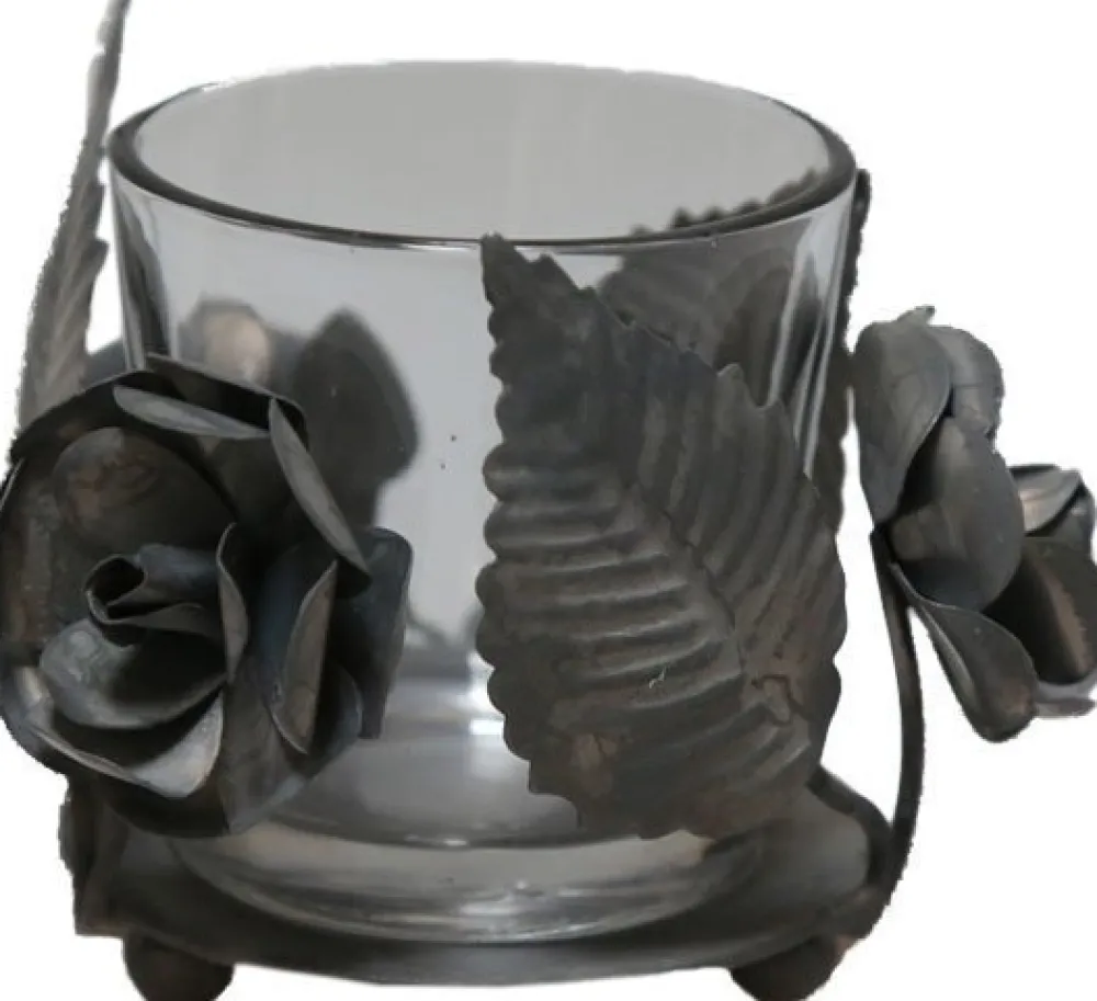 Dieser wunderschöne Teelichthalter von Chic Antique ist ein wahrer Blickfang. Das Glas des Teelichts ist mit edlen Rosen aus Eisen verziert. Insgesamt ein wunderschönes antikes Dekostück.