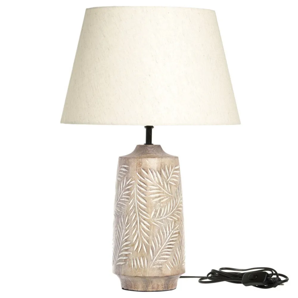 Dekorative Tischlampe, die deinen Raum in ein wunderschönes Licht hüllt. In den Holzfuß sind stilvolle Elemente geschnitzt.