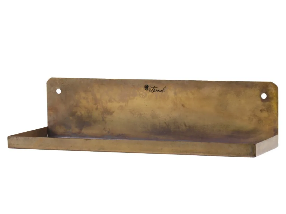 Dieses hübsche Éternel Regal aus Messing von Chic Antique kleidet Badezimmer, Küche oder Schlafzimmer stilvoll aus. In den Farben antik schwarz oder antik messing mit dem schwungvollen Éternel Schriftzug verbreitet das 33 x 11 x 9 cm große Regal eine Eleganz und Raffinesse und kann mit Kerzen, Zahnputzbechern oder Gewürzen vielfältig bestückt werden.