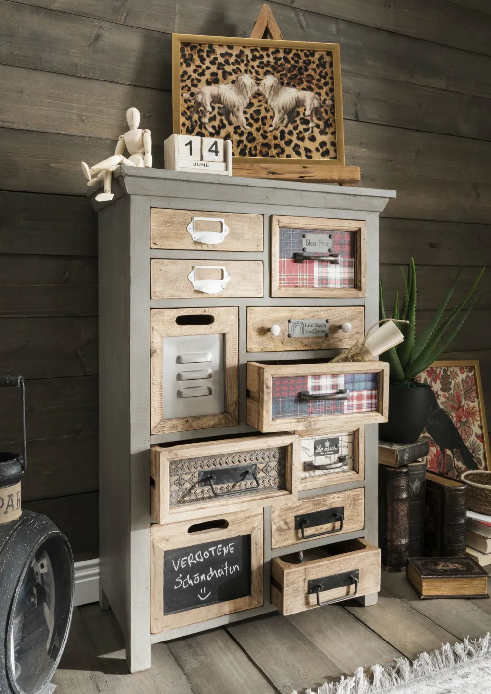 mit 11 Schubladen: Altholz recycelt, teilweise mit Stoff-Applikationen, Metall und Tafel, mit unterschiedlichen Griffen