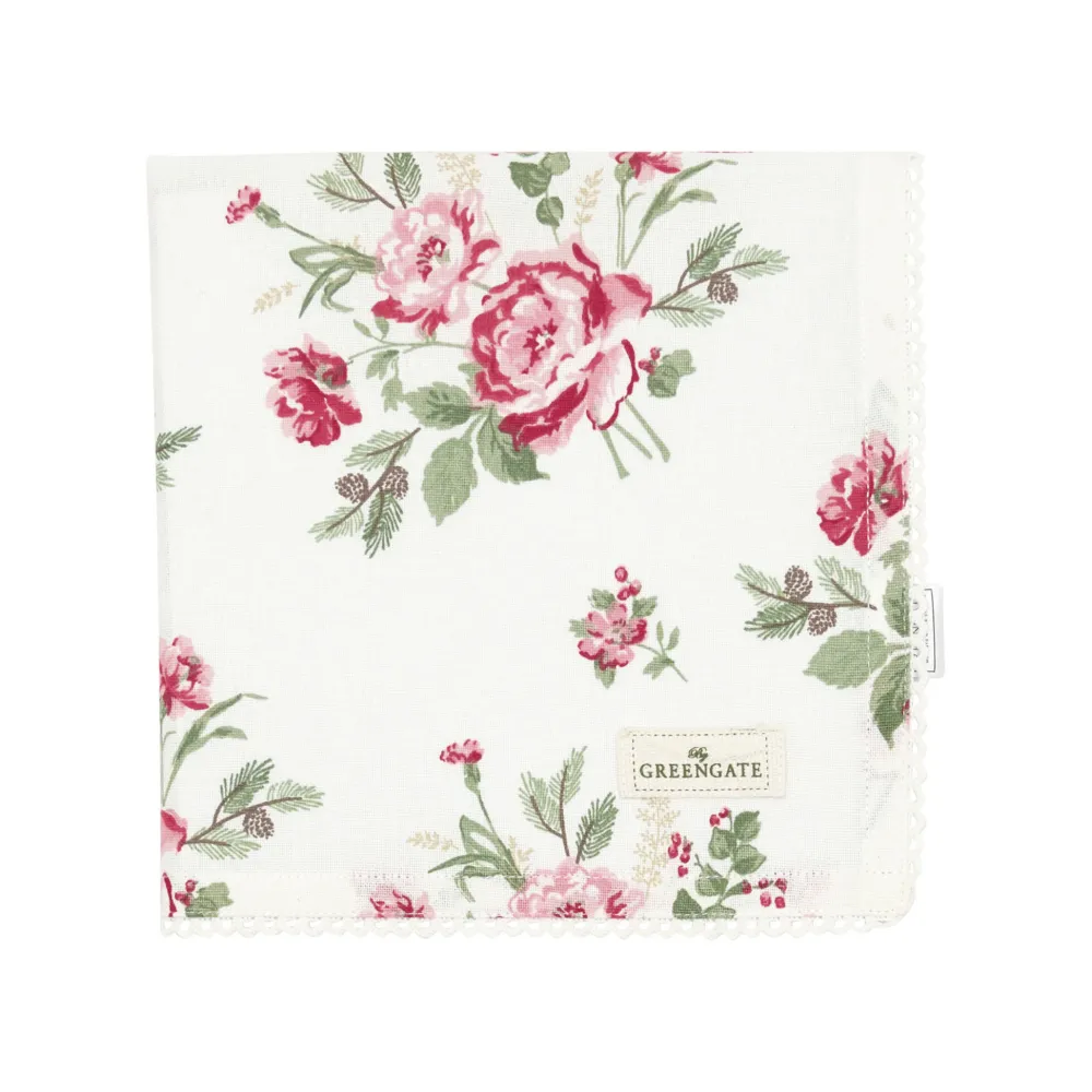 Die Greengate Leonora Serviette mit Spitze in Weiß misst 40 x 40 cm für eine elegante und romantische Tischdeko-Note. Hergestellt aus hochwertiger Baumwolle.