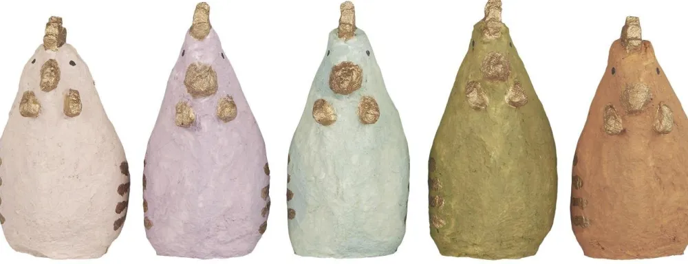 Die schöner Osterhühner sind aus „Katran“, welches aus recycelten Baumwollstoffresten der Bekleidungsindustrie besteht. Aus diesen Resten wird eine Baumwollmasse hergestellt, um die kleinen Figuren zu formen – und schließlich werden sie von Hand bemalt.