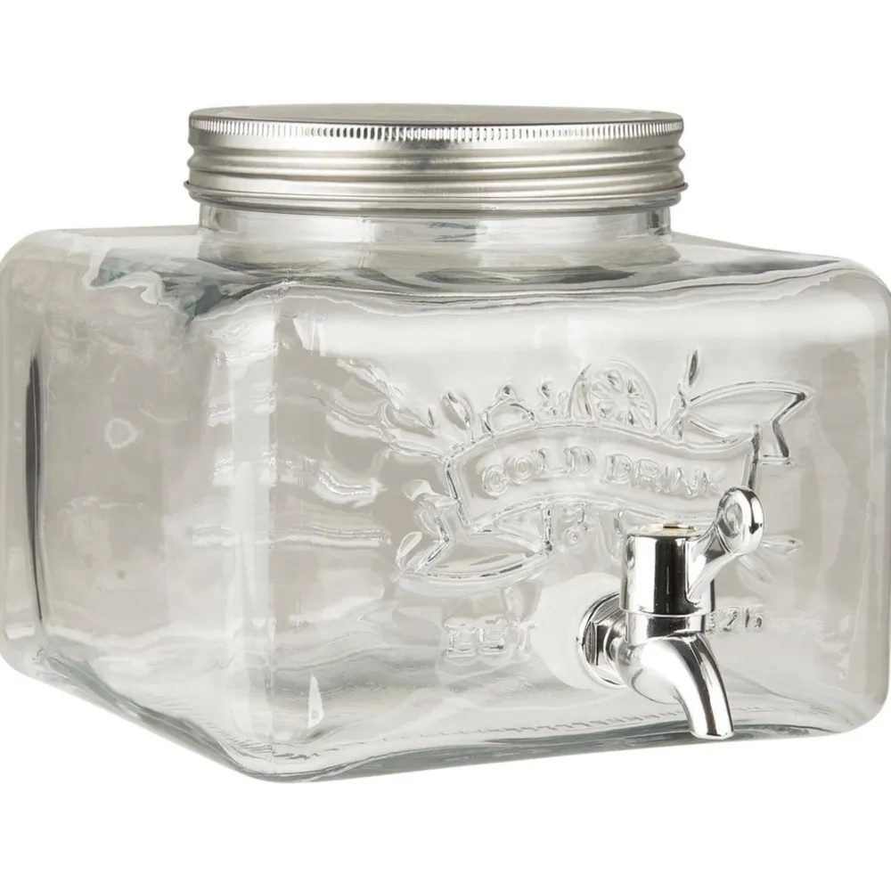 Praktischer Getränkebehalter mit einem Metalldeckel und einem Fassungsvermögen von 3,6 Litern, ideal zum Servieren von Saft, Wasser oder anderen Getränken. Das Design ermöglicht es, ihn auf ein Kühlschrankregal zu stellen, um die Getränke kühl zu halten. Bitte beachten Sie, dass der Deckel beim Zapfen nicht aufgesetzt sein sollte, da ein Vakuum den Durchfluss blockieren kann.