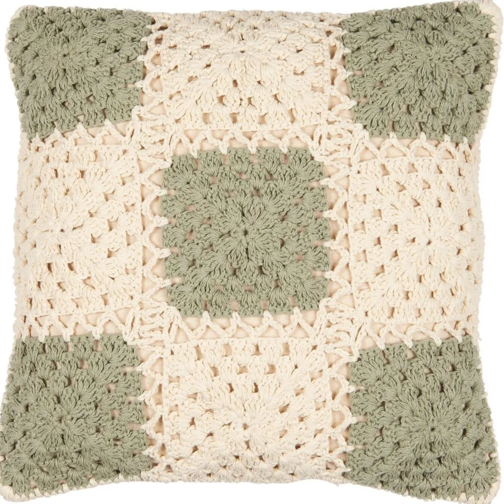 Handgehäkelter Kissenbezug in creme mit grünen Karos, was einen zeitlosen und eleganten Stil verleiht. Die Rückseite ist aus cremefarbenem Canvas, wodurch das Kissen vielseitig einsetzbar und leicht mit anderen Textilien kombinierbar ist. Ein dekoratives Detail, das Wärme und Charme in jede Einrichtung bringt.