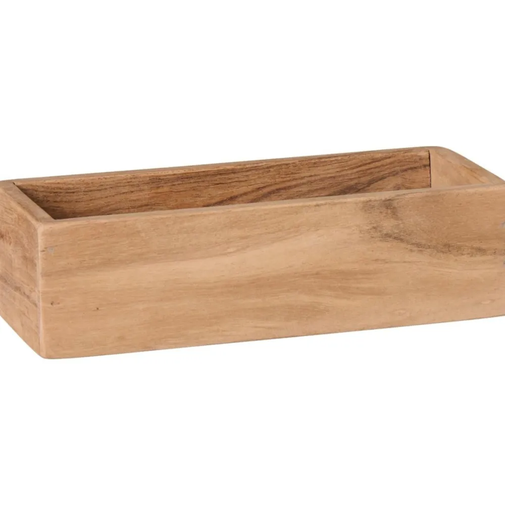 Acacia. Rustikale längliche Kiste aus Akazienholz mit einer natürlichen Oberfläche, die die warmen Töne und die deutliche Struktur des Holzes hervorhebt.