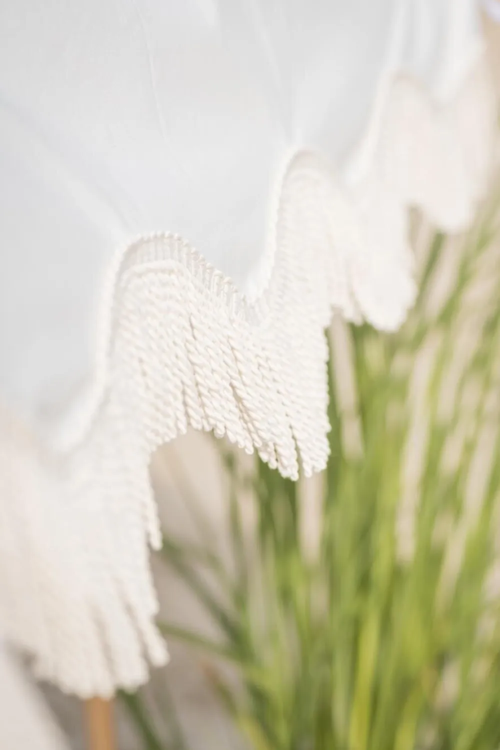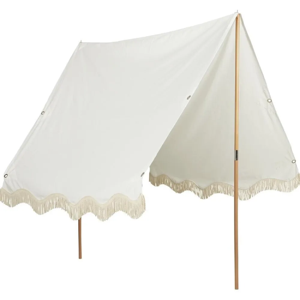 Dieses elegante weiße Sonnensegel mit Holzstangen und Fransen ist perfekt für jeden Strandausflug. Stecken Sie die Stangen in den Sand und entfalten Sie das Segel, um einen kühlen Schattenplatz zu schaffen, an dem Sie sich entspannen, ein gutes Buch genießen oder einfach den Wellen beim Einrollen zusehen können. Die naturfarbenen Fransen des Sonnensegels verleihen einen Hauch von Bohème-Charme. Der Stoff ist wasserabweisend, aber verlängern Sie die Lebensdauer des Sonnensegels, indem Sie es vor feuchten Wetterbedingungen schützen, und verpacken Sie es erst, wenn der Stoff trocken ist.