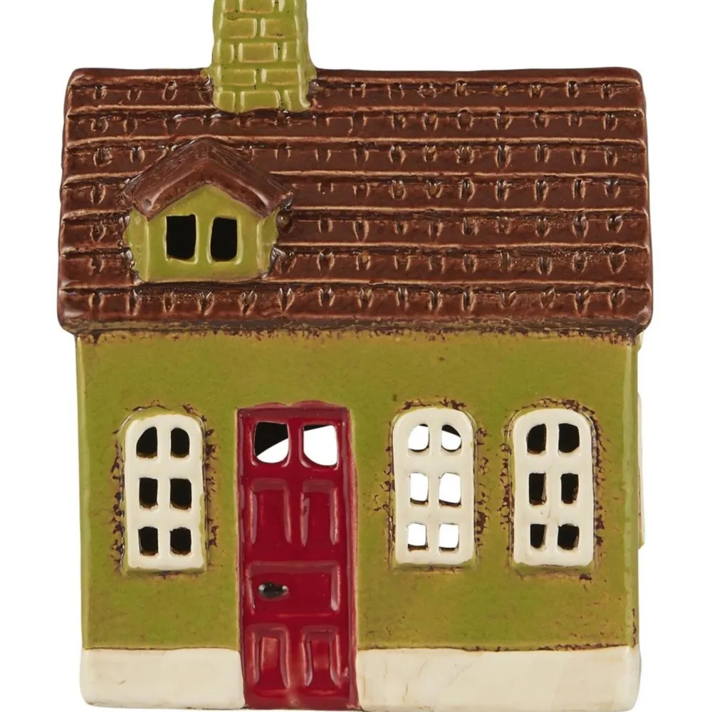Teelicht-Häuschen My Home Town mit Gaube rote Tür von IB Laursen aus Dänemark. Die kleinen, beliebten Keramikhäuser liegen im Trend, unser Zuhause mit Kunsthandwerk zu schmücken. Beim Glasieren von Keramik herrscht immer ein gewisses Maß an Unvorhersehbarkeit, und während des Brennens werden die Farben lebendig. Genau das verleiht den kleinen Häusern ein einzigartiges und originelles Aussehen, mit kleinen Farbunterschieden und rustikalen Kanten.