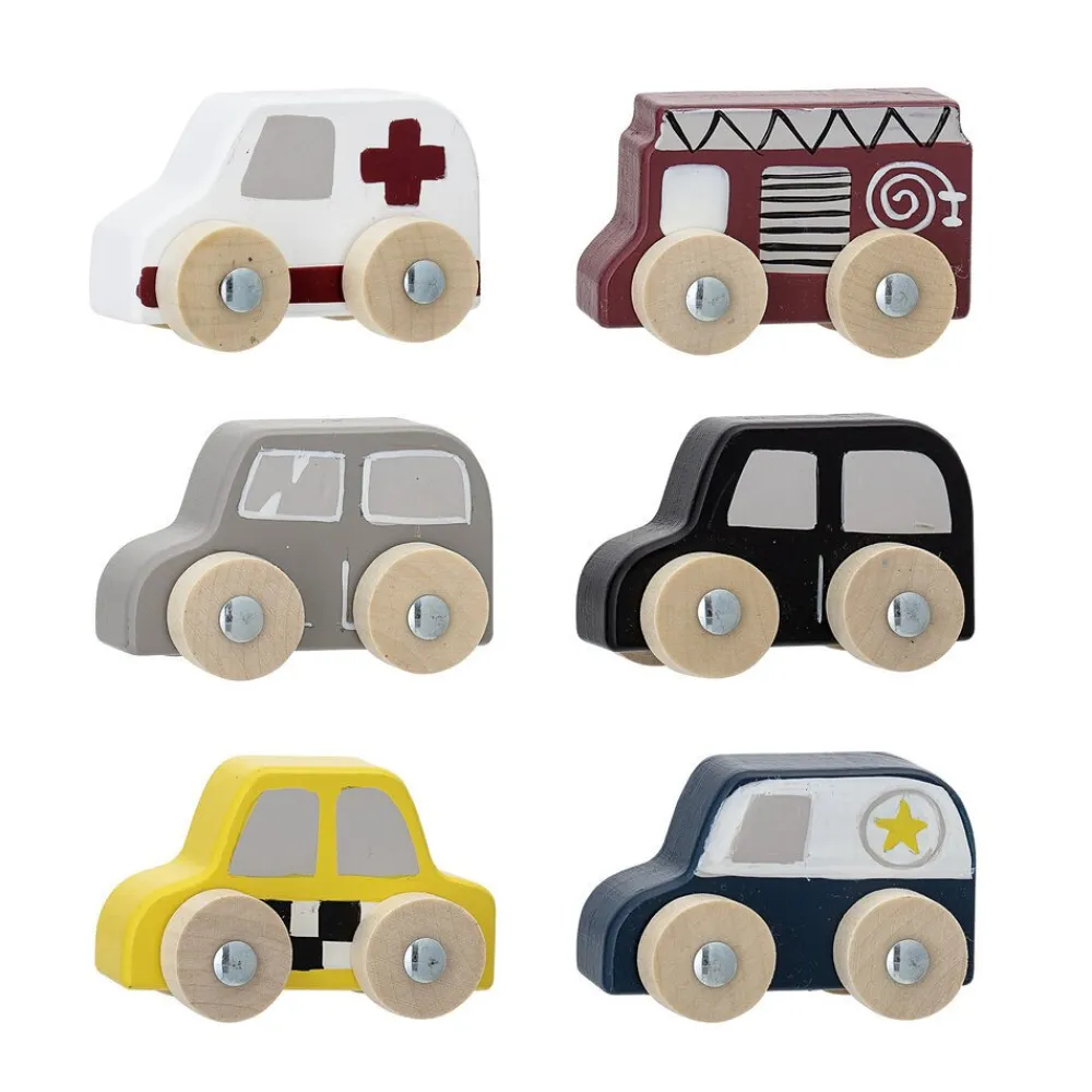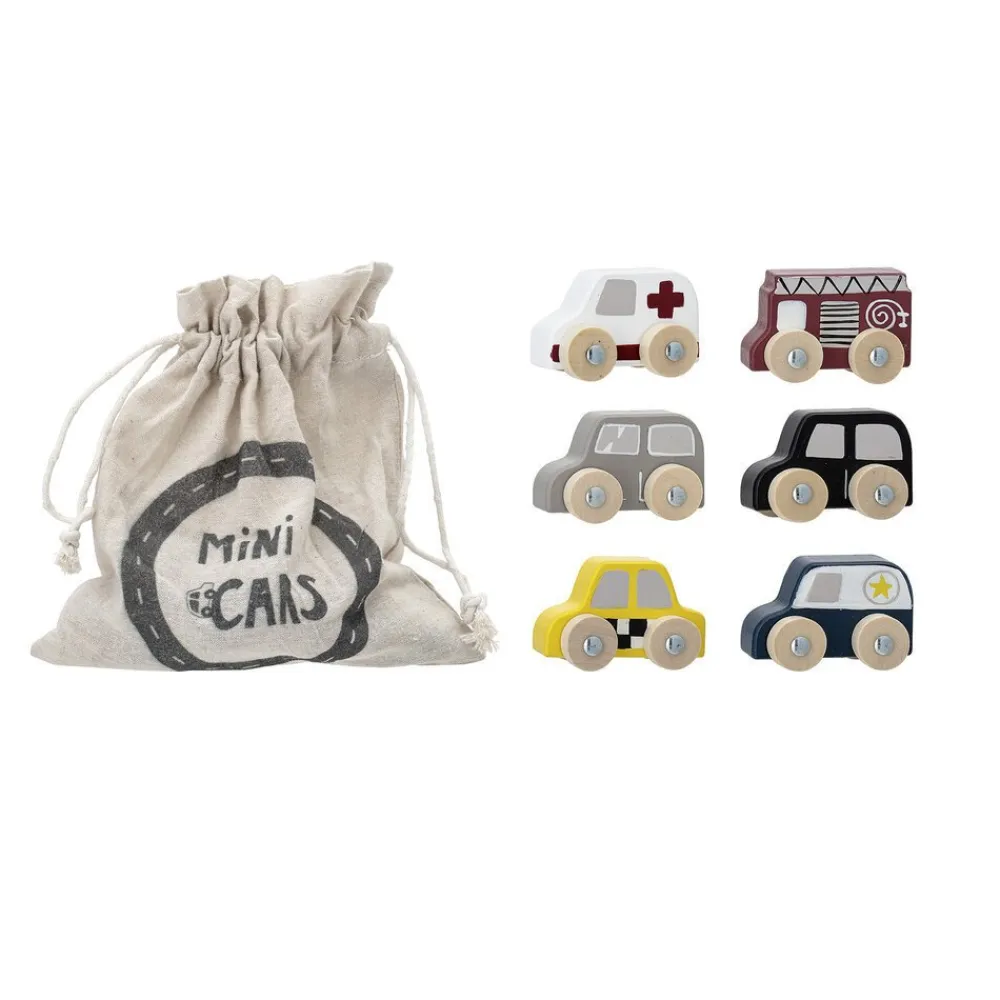 Dieses schöne Spielzeug Auto Set Avin aus Holz von Bloomingville Mini ist ein tolles Geschenk für jeden Auto Fan. Die 6 Autos im Leinen Sack beinhalten einen Krankenwagen, ein Feuerwehrauto, ein Taxi, ein Polizeiauto und zwei schlichte Gefährten. Zusammen mit einem Spielteppich lassen sich wunderbare Geschichten erfinden. Ab 18 Monaten geeignet.