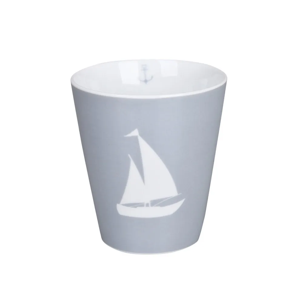 Das Bootsmotiv auf dem Becher zeigt ein klassisches Segelboot auf einem farbigen Hintergrund. Die klaren Linien und die sorgfältige Gestaltung verleihen dem Becher eine zeitlose Eleganz, die ihn zu einem Blickfang auf jeder Tafel macht.