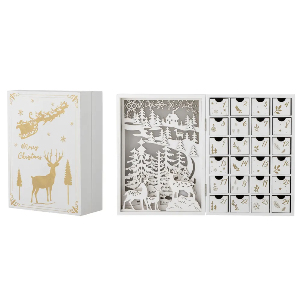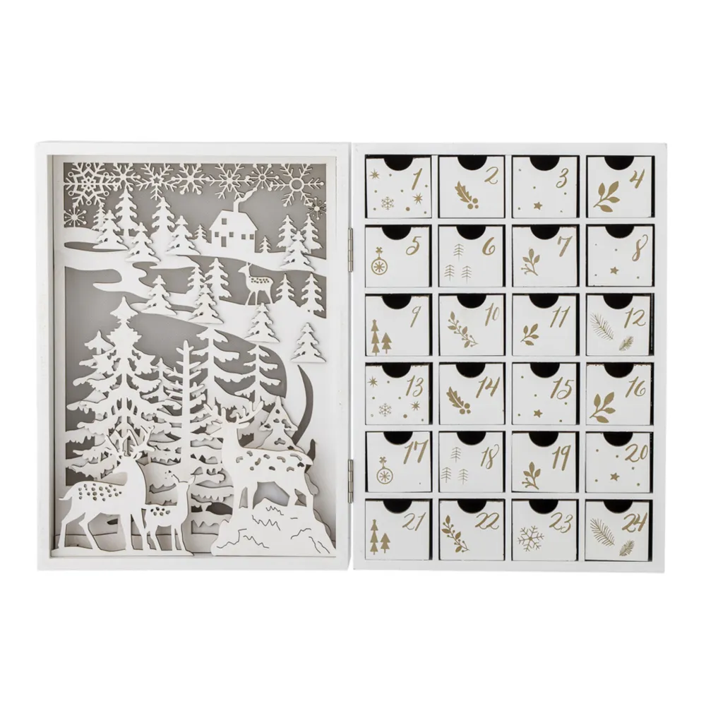 Elimar Adventskalender mit Licht von Bloomingville aus Dänemark. Der Elimar Kalender von Bloomingville ist als bezaubernde Winterszene gestaltet und mit detaillierten Schnitzereien geschmückt. Zusätzlich sind eingebaute Lichter vorhanden, die eine idyllische Kulisse für den Countdown bis Weihnachten schaffen. Der Kalender besteht aus 24 kleinen Schubladen, nummeriert von 1 bis 24, wobei jede Schublade mit eleganten Gold- und Weißmotiven verziert ist. Diese Schubladen bieten eine einzigartige Möglichkeit, Ihre Weihnachtstradition zu personalisieren, indem Sie selbst kleine Geschenke, Süßigkeiten oder Grüße hineinlegen – eines für jeden Tag bis Heiligabend.