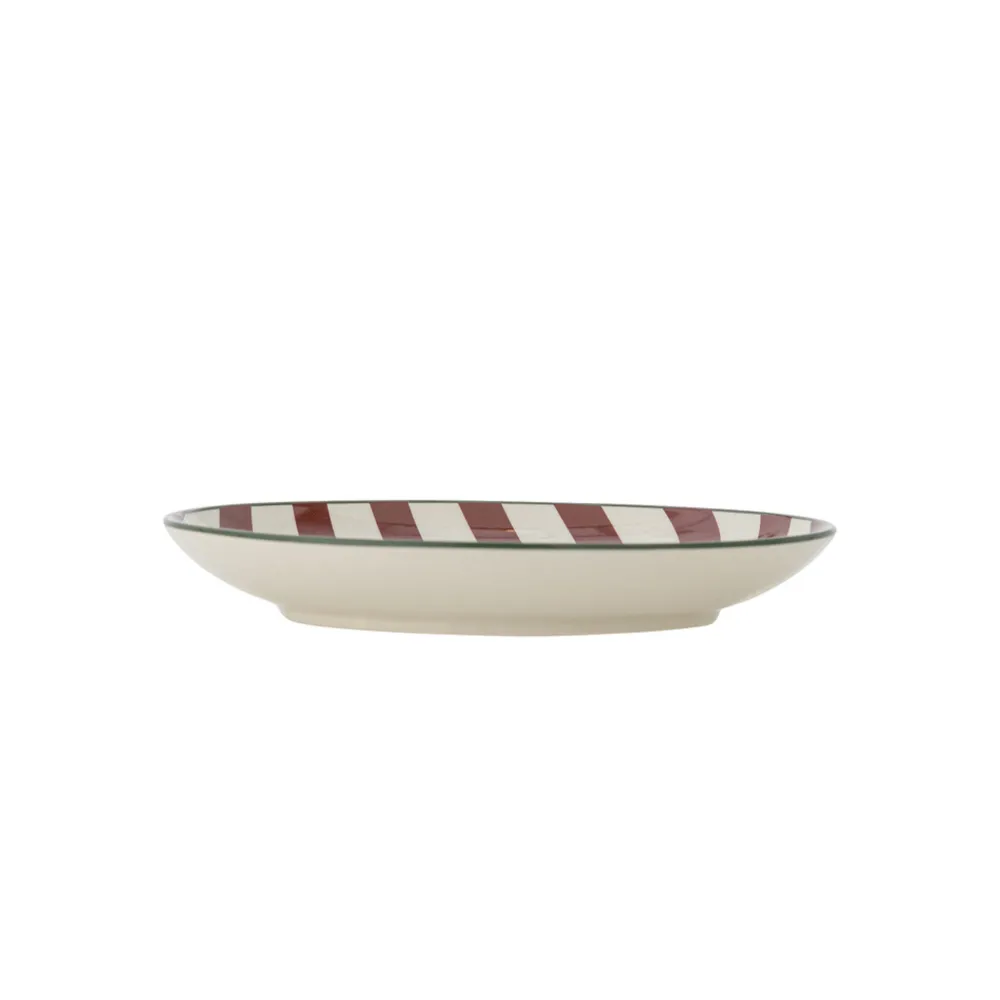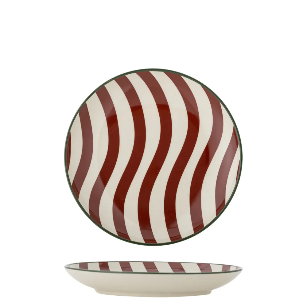 Jolly Teller, Rot, Steingut von Bloomingville aus Dänemark. Der Jolly Teller von Bloomingville ist ein eleganter Dessertteller mit einem gedruckten, gestreiften Motiv. Der handbemalte grüne Rand verleiht der Tischdekoration eine charmante Note und stellt sicher, dass jeder Teller einzigartig ist. Perfekt für alltägliche sowie festliche Anlässe, schafft der Teller eine warme und einladende Atmosphäre.