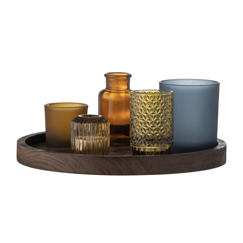 Sanga Kerzen-Tablett mit Teelichthaltern, Braun, Glas von Bloomingville aus Dänemark. Das Tablett Sanga mit Teelichthaltern von Bloomingville ist eine wunderschöne und elegante Dekoration. Erhältlich als rundes Tablett aus dunklem Paulownia-Holz mit fünf Glasteelichthaltern, die Sie als Deko nutzen können.