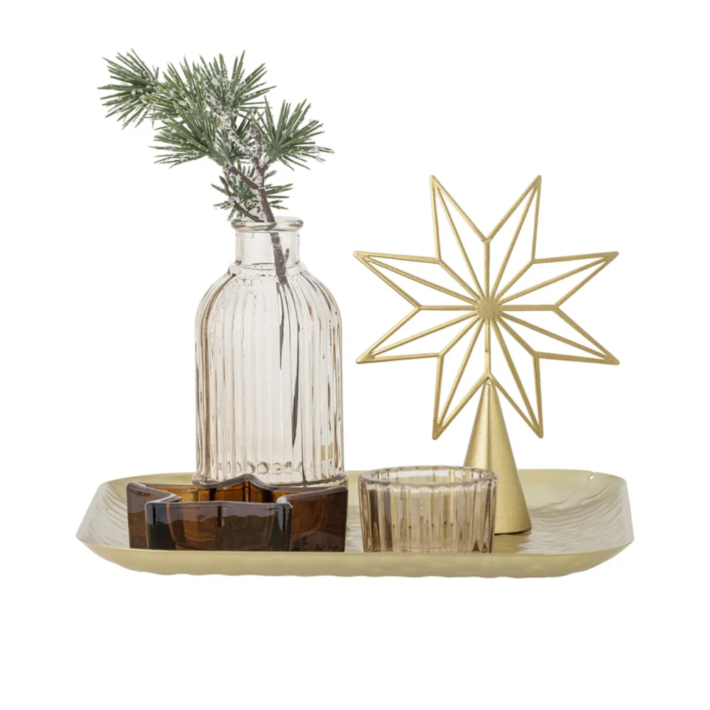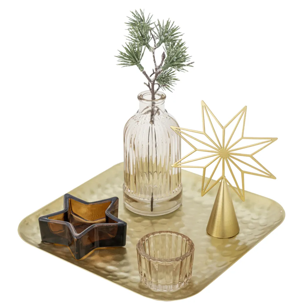 Sanga Tablett mit Teelichthaltern, Gold, Glas von Bloomingville aus Dänemark. Das Sanga Tablett mit Teelichthaltern von Bloomingville ist eine wunderbare Bereicherung für Ihre Weihnachtsdekorationen. Gefertigt mit einem eleganten Goldfinish, zeigt dieses Tablett eine harmonische Anordnung von Votivkerzen und einer Vase, wunderschön verziert mit einem künstlichen Tannenzweig. Sein zeitloses Design fügt sich nahtlos in jede Dekoration ein und macht es perfekt als stilvolles Gastgebergeschenk oder als raffinierte Ergänzung zu Ihren Feiertagsdekorationen.