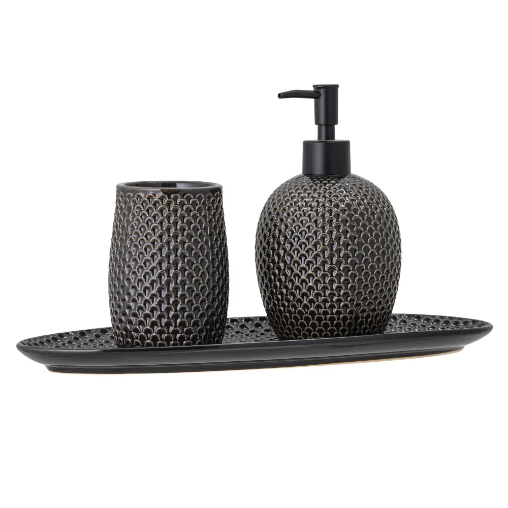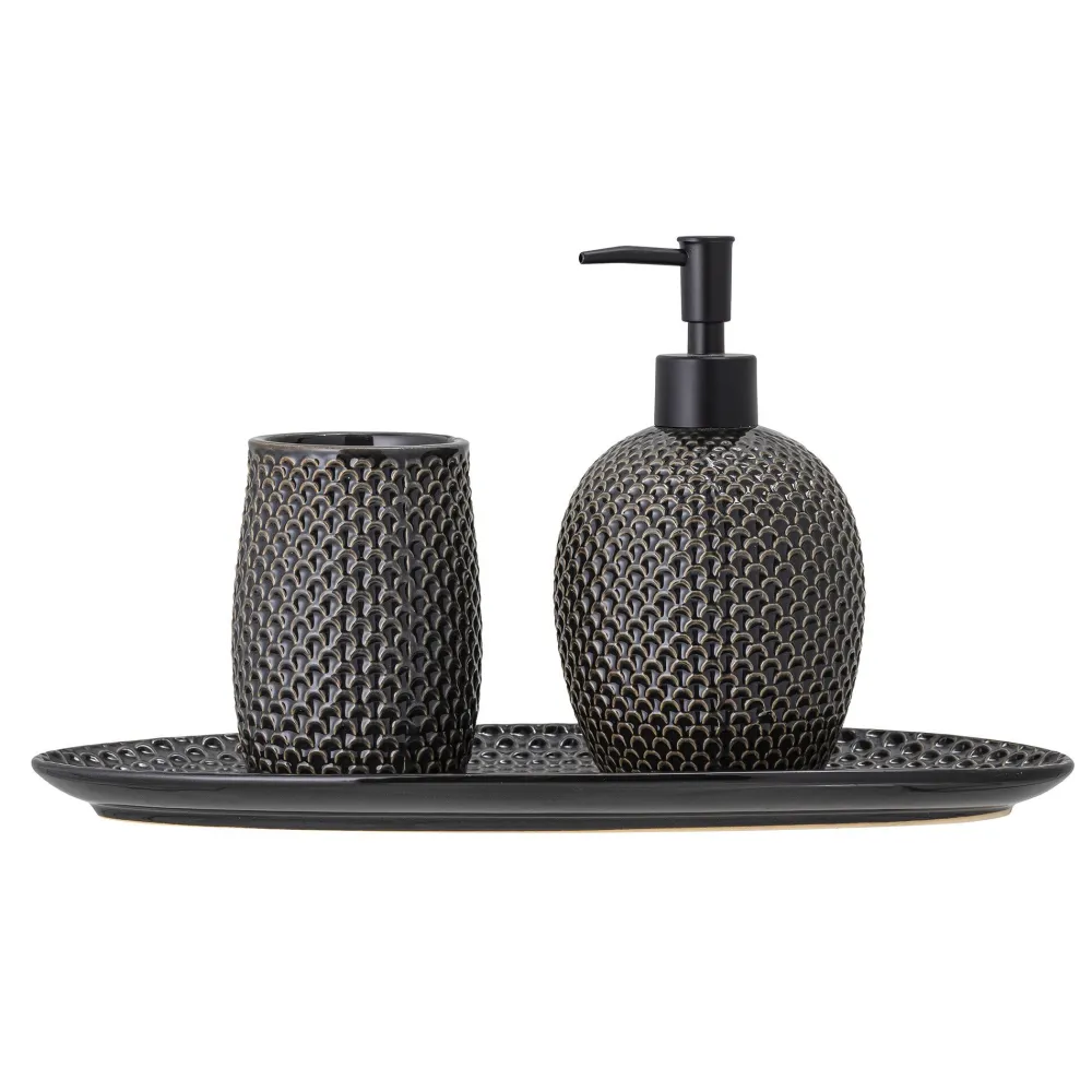Stilvolles Seifenspender-Set aus grauem Steingut von Bloomingville. Mit seinem nordischen Look passt das Set einfach perfekt in moderne Einrichtungsstile und sorgt für tolle Akzente im Badezimmer.