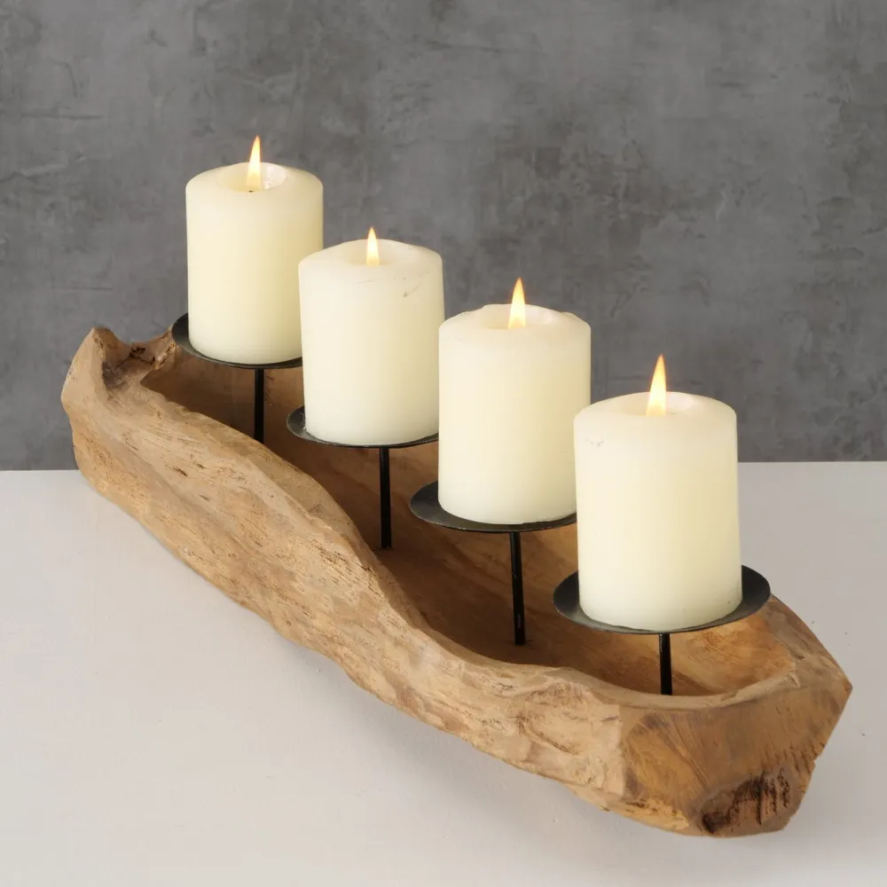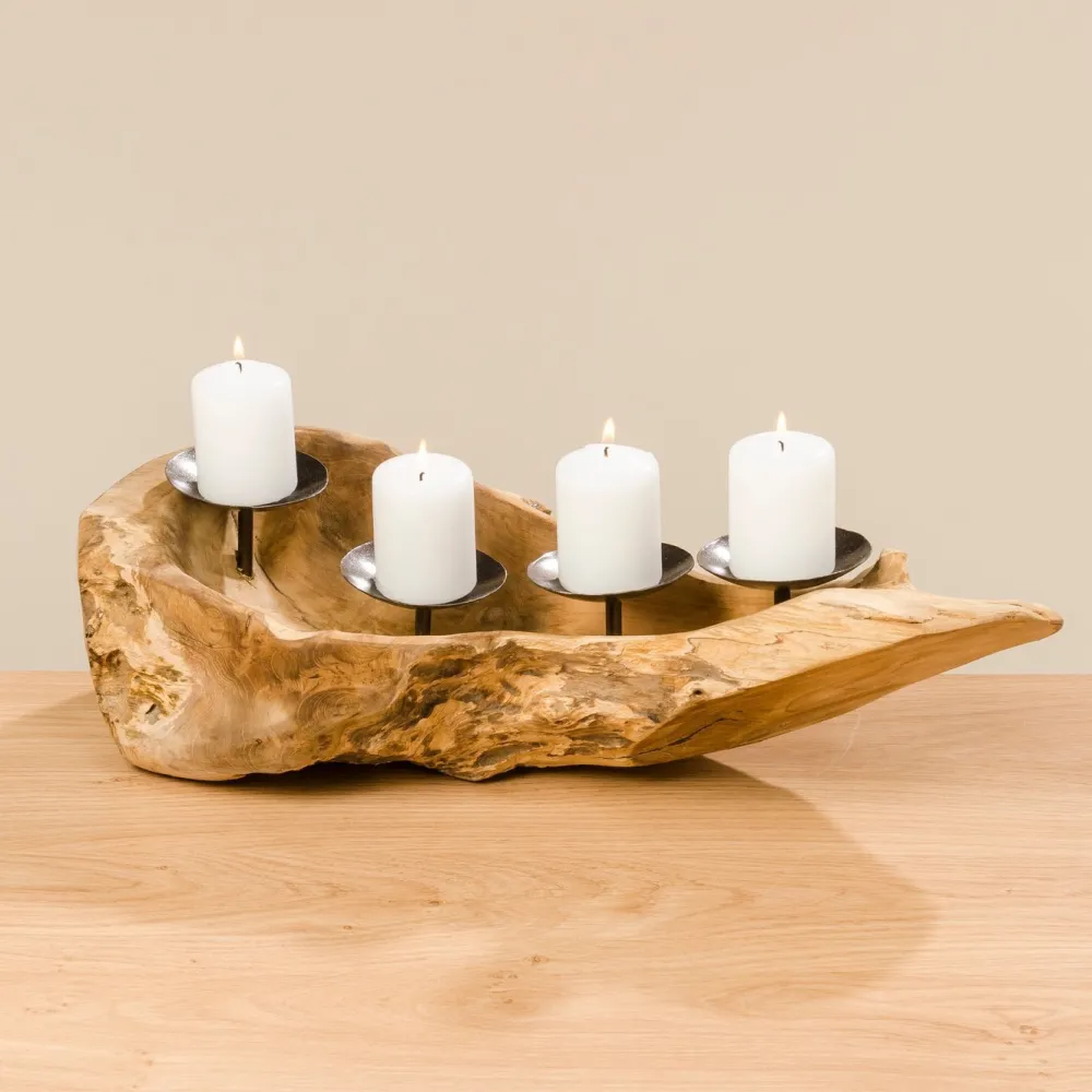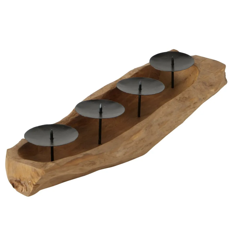 Wunderbarer Kerzenhalter Nafia aus Teakholz mit 4 Halterungen für Stumpenkerzen.