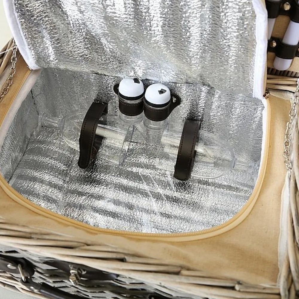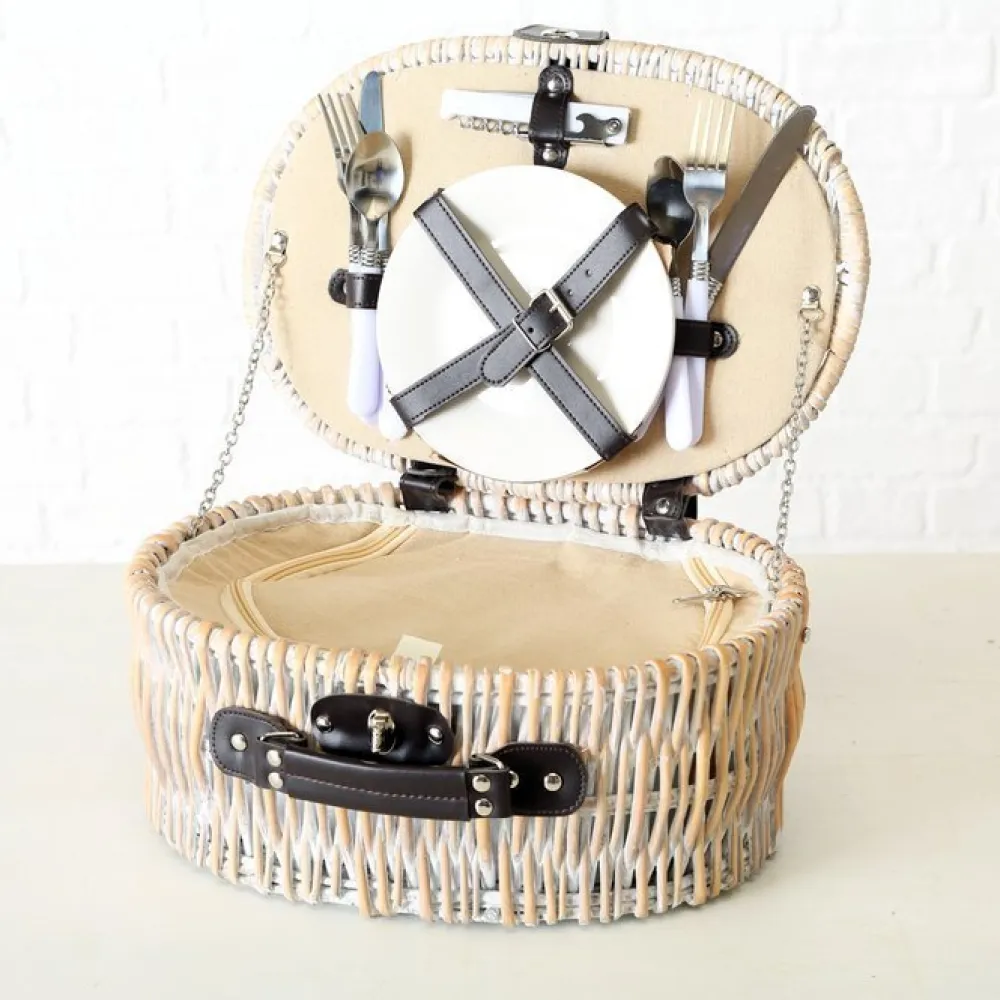Dieser tolle Picknickkorb aus der Serie White Garden von BOLTZE verhilft dir und deinem Partner zu mehr Zweisamkeit. Ausgestattet mit einem kompletten Geschirr und Besteck Set für 2 Personen und einer Kühltasche könnt ihr eure liebsten Leckereien in diesen Korb legen und euch auf zu einem schönen Ort zum picknicken machen. Bei beiden Versionen ist größtenteils das gleiche Zubehör in leicht unterschiedlichem Design dabei. Der runde Korb beinhaltet zwei Becher, während der eckige zwei Wein bzw. Sekt Gläser vorweist und zusätzlich Salz und Pfeffer Streuer.