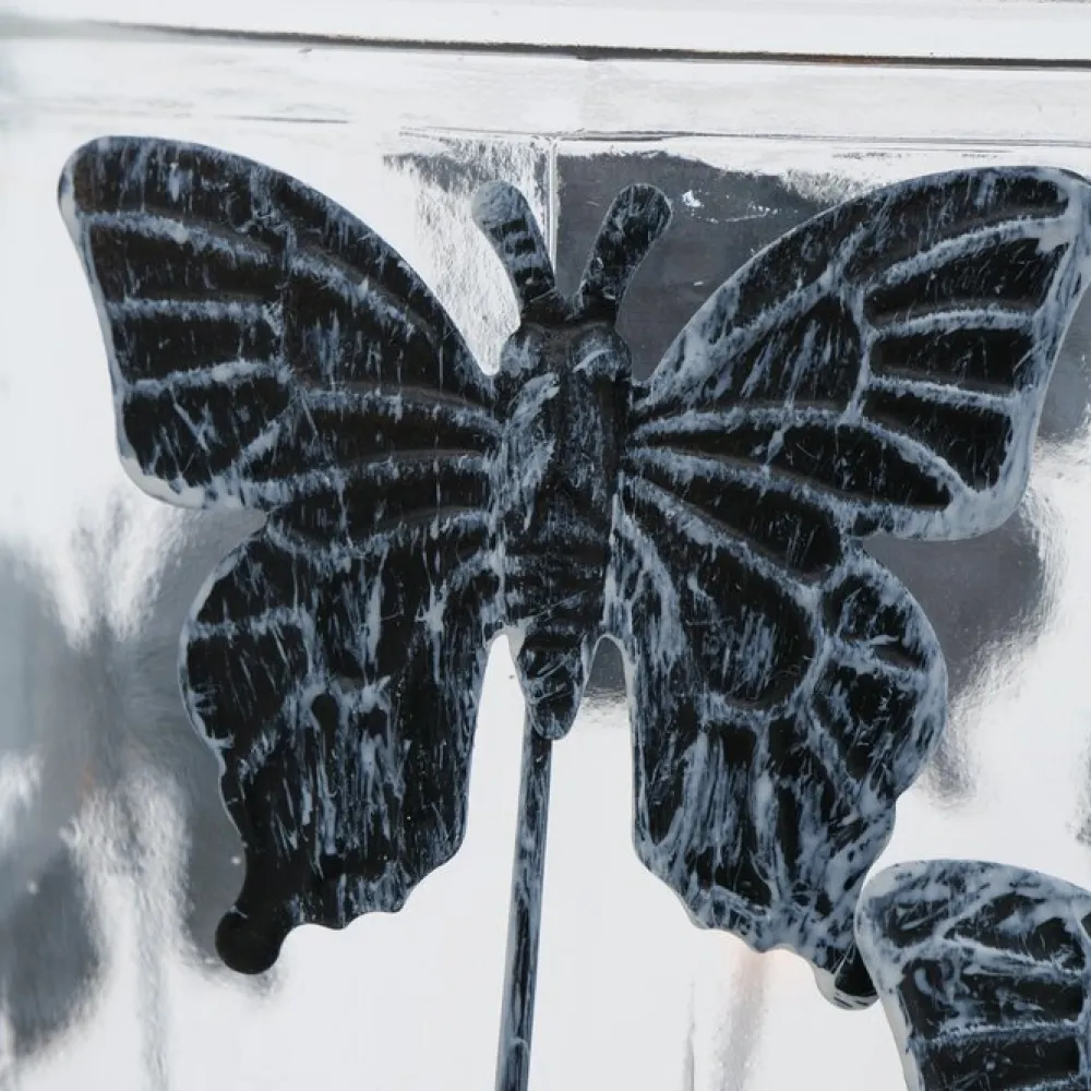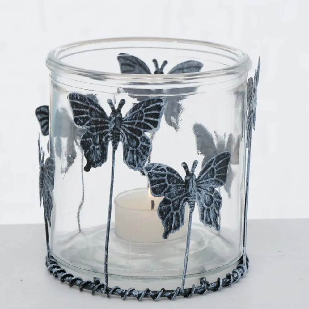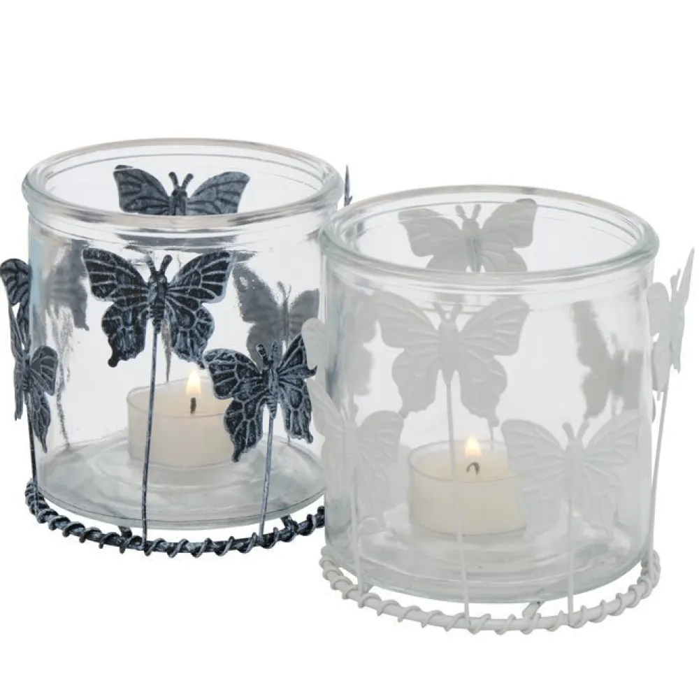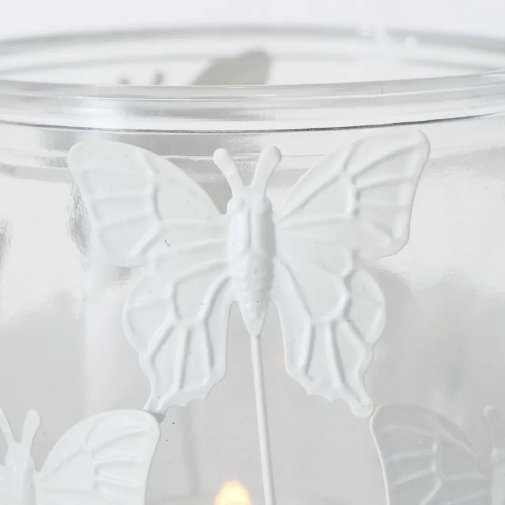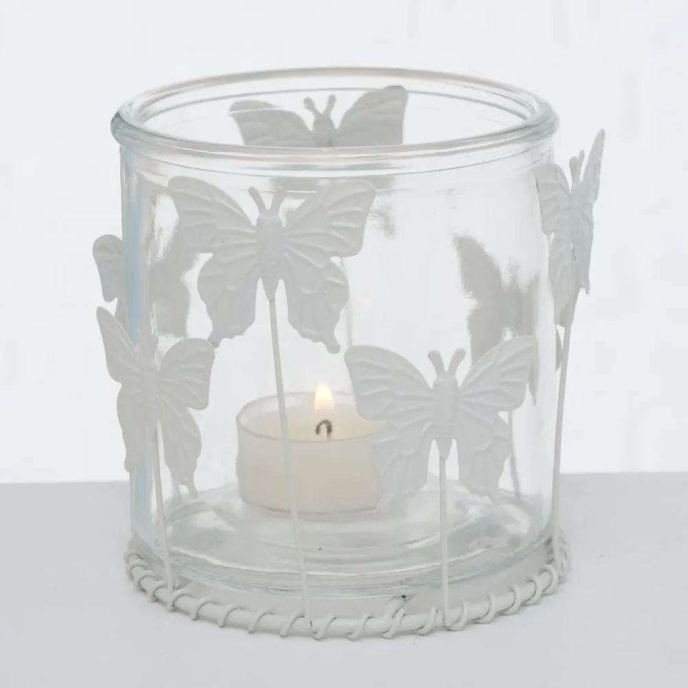 Schaffe eine romantische Atmosphäre in deinem Garten mit diesem zauberhaften Windlicht Elsa aus der Serie White Garden von Boltze. Die niedlichen Schmetterlinge aus Eisen und schwarz oder weiß umhüllen ein klares Glas, in dem du ein Teelicht umringt von Sand, Perlen oder ähnlichem platzieren kannst. Stelle es auf den Tisch auf deiner Terrasse oder deinem Balkon. Auch Drinnen verbreitet das Teelichtglas seine Magie.