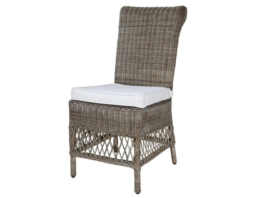 Der Stuhl besteht aus Rattan, Baumwolle und Polyester. Die Füllung des Sitzkissens setzt sich aus folgenden Materialien zusammen: 30% Gewebefaser und 70% Polyurethanschaum.