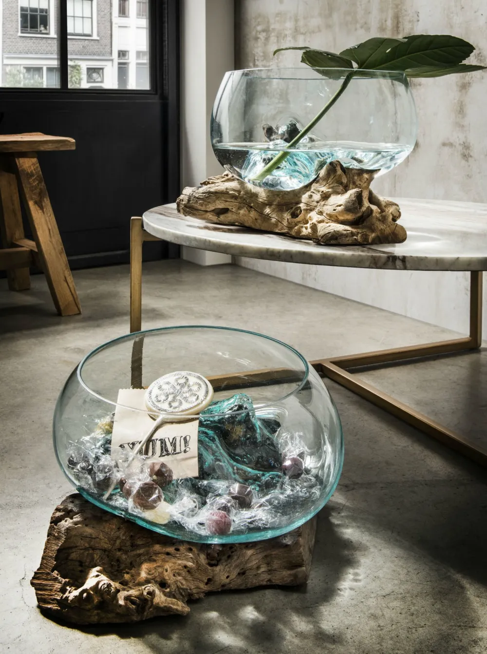 Wundervolle Unikat-Dekowurzel aus Teak mit Glasschale, Glasschale mundgeblassen aus der Faktorei.