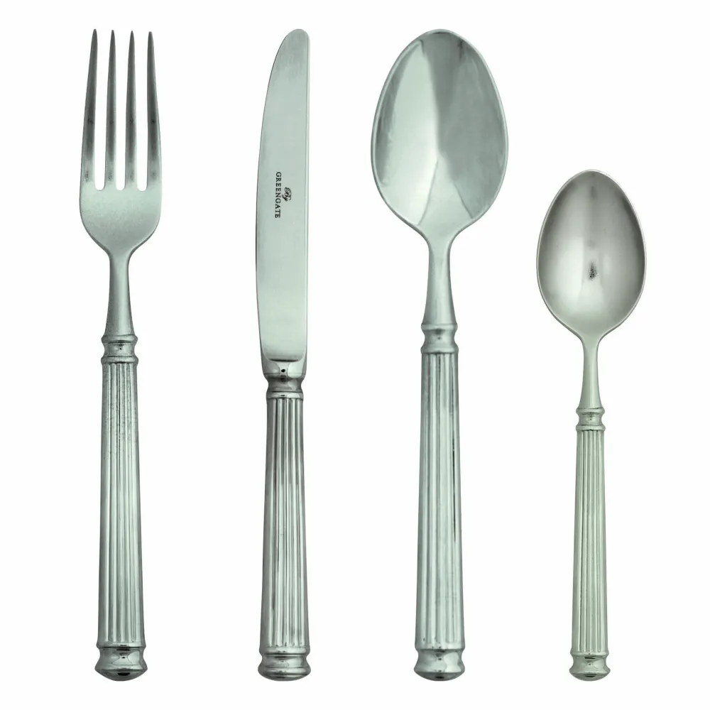 Silberfarbenes Besteck Set aus Edelstahl von GREENGATE. Die säulenartigen Griffe geben diesem wundervollem Besteck eine antike Note und ein prunkvolles Flair.