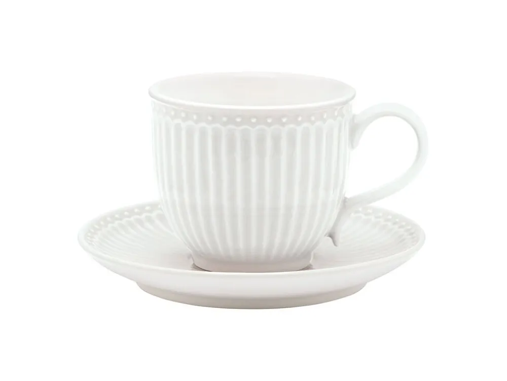Ein wahrer Klassiker! Diese freundliche Tasse mit Untertasse aus der schönen Serie Alice von GreenGate überzeugt im eleganten Rillenmuster und in angenehmen Farbtönen.