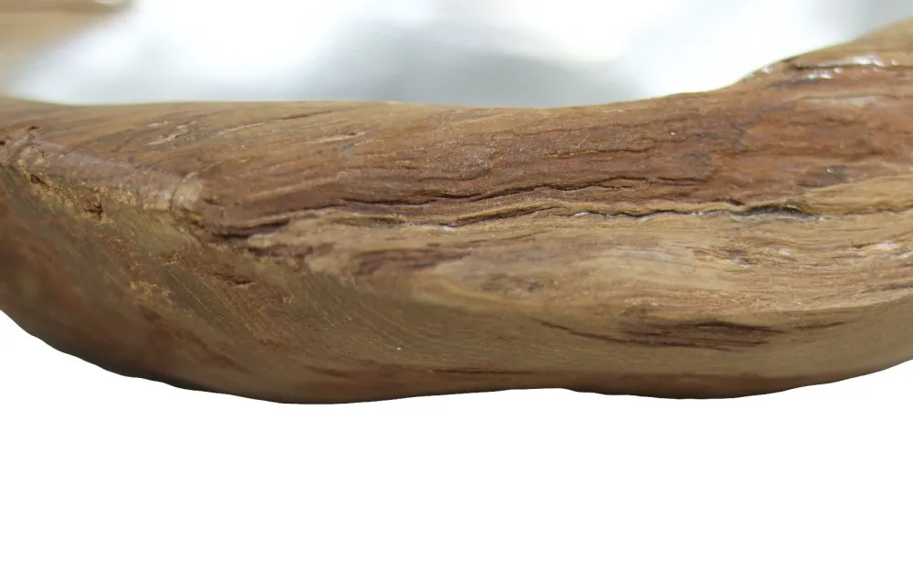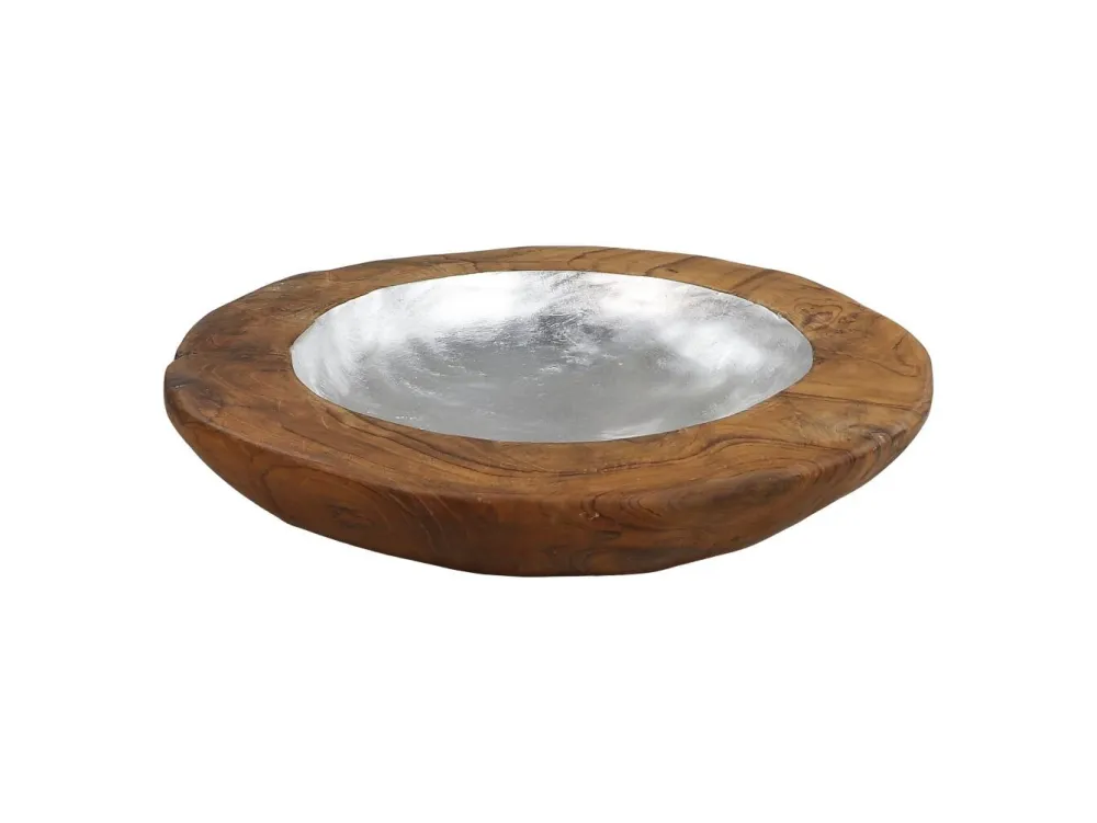 Die Obstschale Teakholz mit Aluminiumschale in silber hat runde Formen, ist aus echtem Teakholz und hat eine schöne glatte Oberfläche.