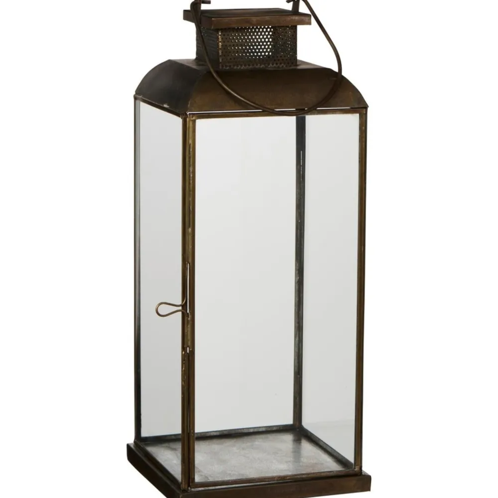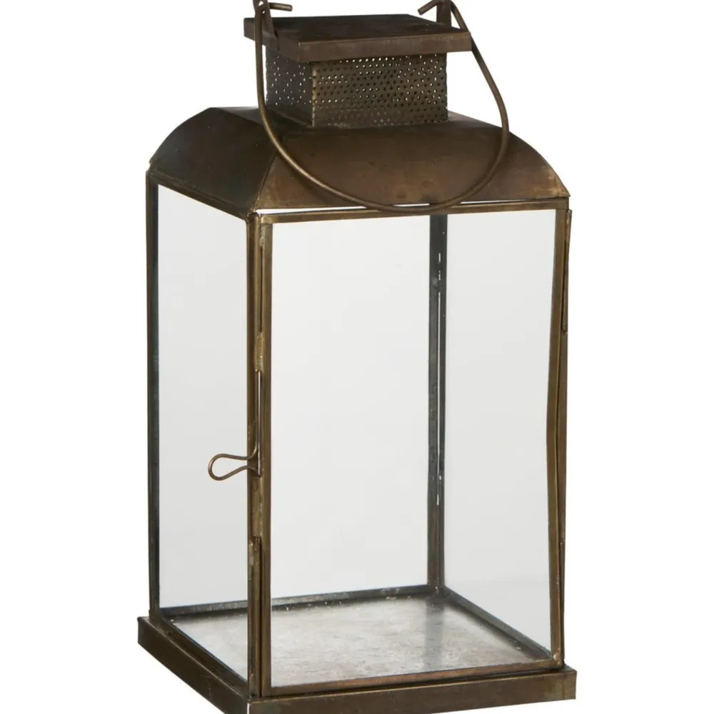 Metall, Glas. Die David-Laterne ist aus dunklem Metall gefertigt und mit Seiten aus klarem Glas sowie einem dekorativen Lochmuster oben versehen. Die quadratische Form und die glatte Metalloberfläche verleihen der Laterne einen minimalistischen und klassischen Ausdruck.
