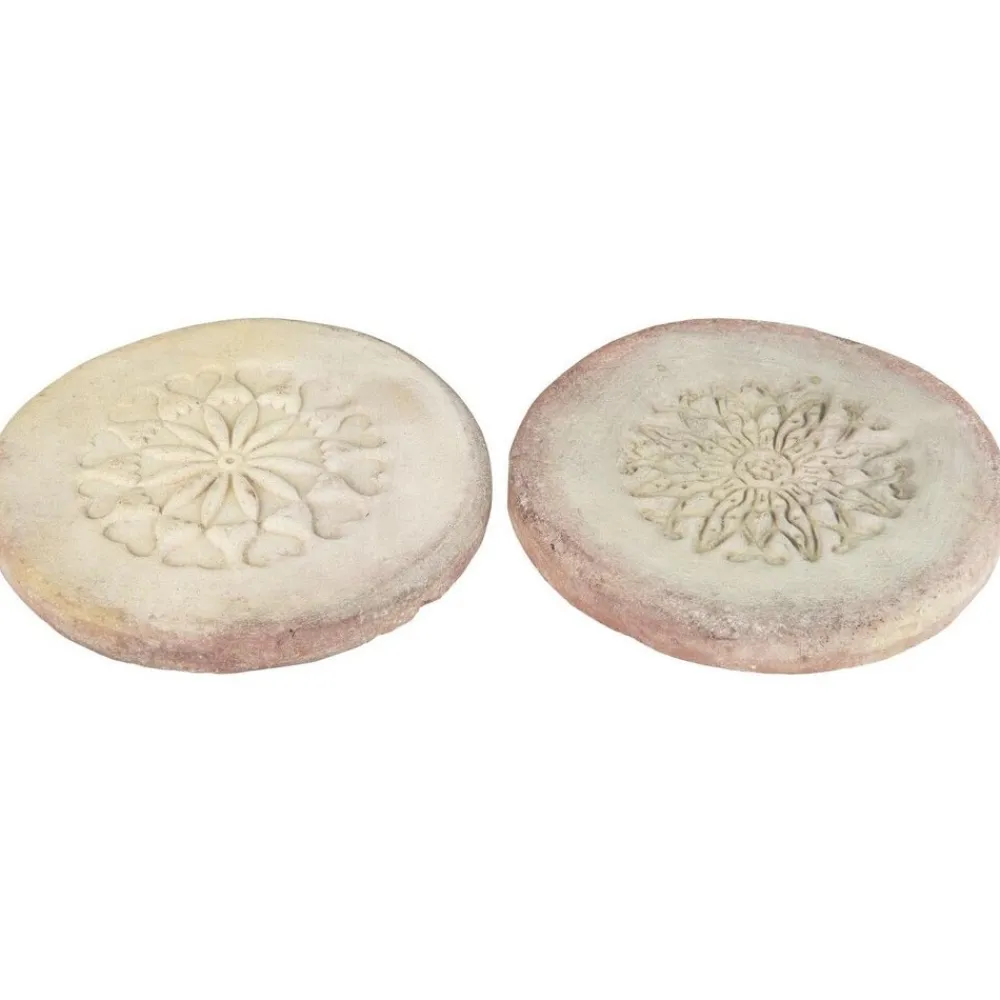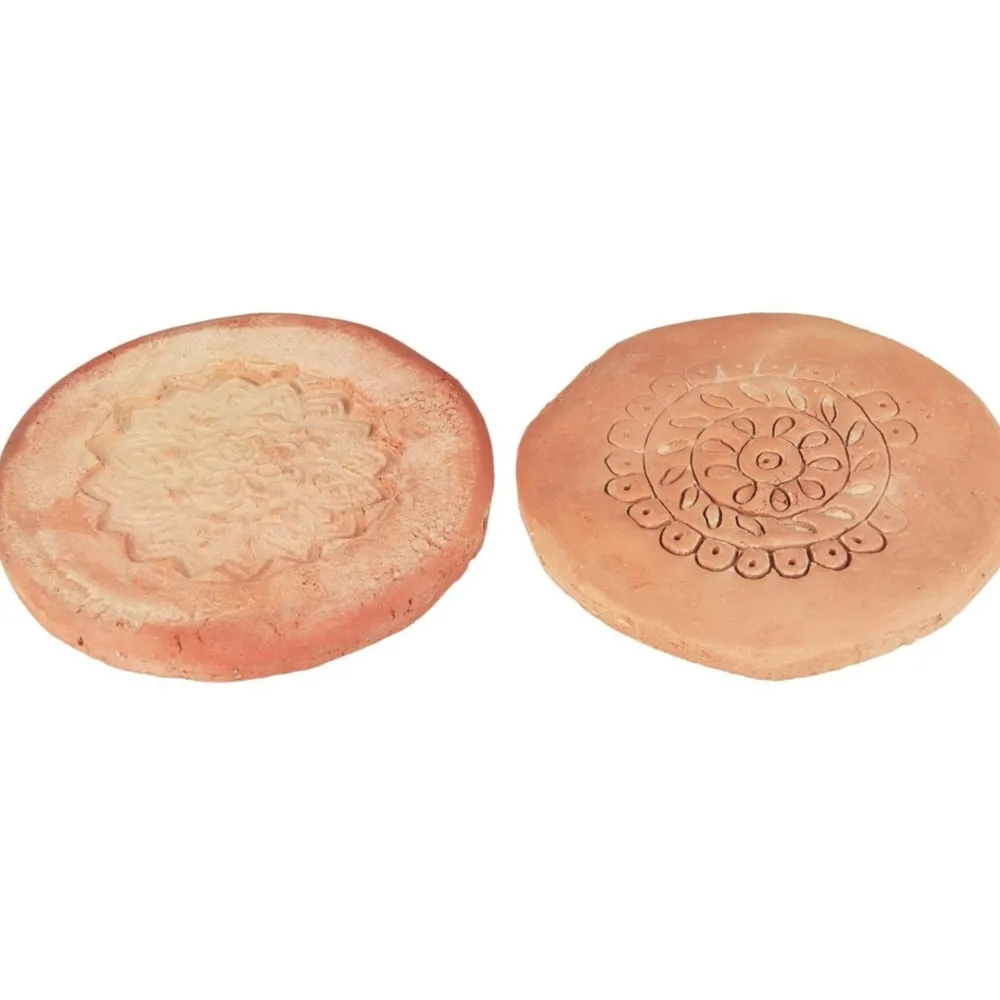 Einzigartige Terrakotta Untersetzer mit aufwendigem Blumenmuster. Durch die Beschaffenheit sieht jeder Untersetzer einzigartig aus und kann sich in Form und Farbe unterscheiden. Filzpunkte auf der Unterseite sorgen für sicheren Halt.