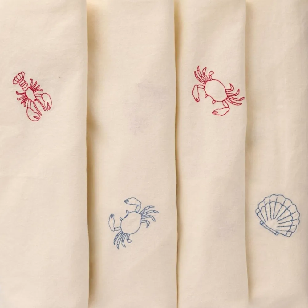 Wunderschöne quadratische Tischdecke in der klassischen Butter Cream-Farbe mit eleganten Stickereien von Hummern, Krabben und Muscheln. Perfekt, um eine maritime und einladende Atmosphäre am Tisch zu schaffen. Kombinieren Sie sie mit den passenden Stoffservietten für einen harmonischen und stilvollen Look.