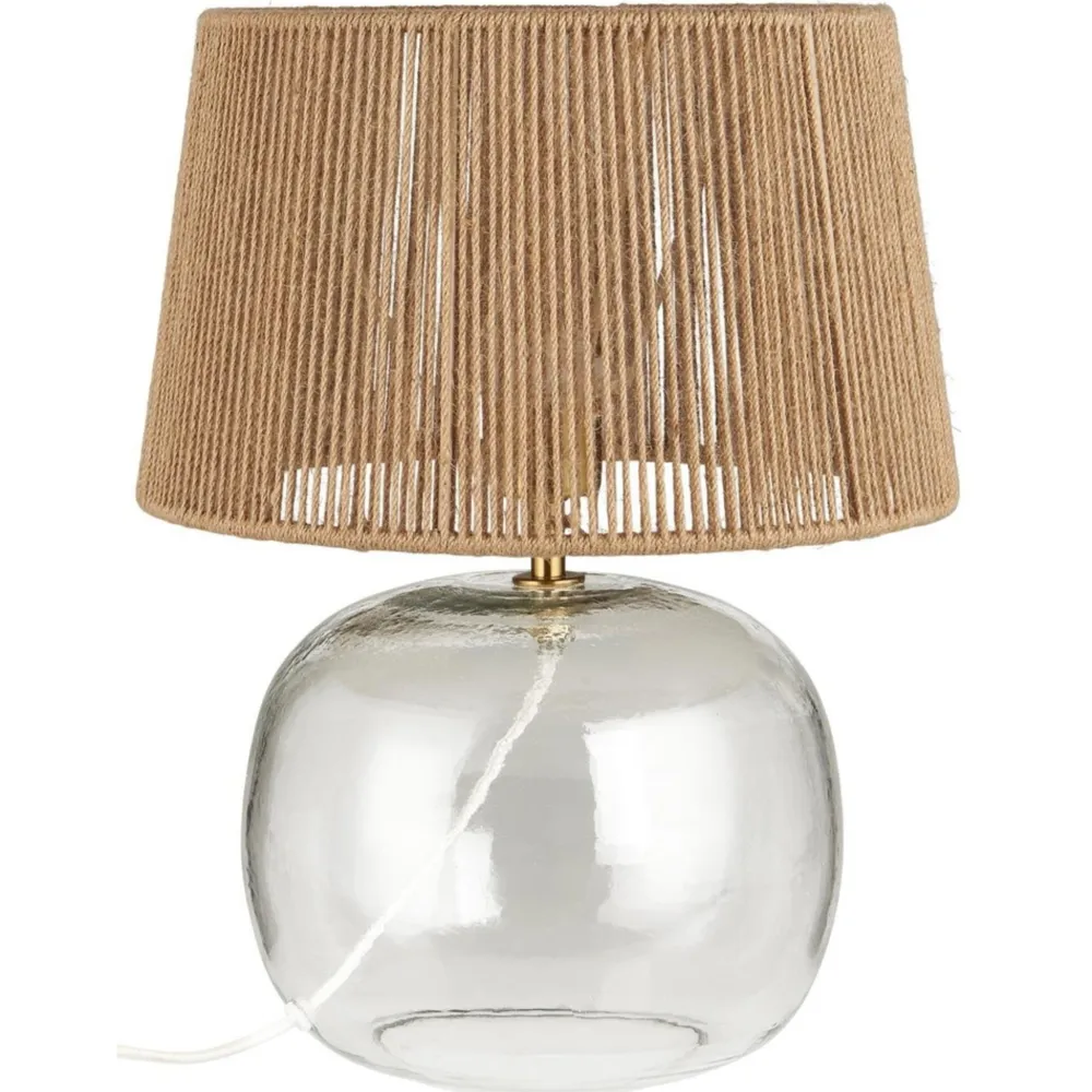 Stilvolle Tischlampe mit einem mundgeblasenen Glassockel und einem handgefertigten Lampenschirm aus natürlichem Jute. Die Lampe verfügt über eine weiße Leitung mit Schalter (L220 cm), was sie einfach zu platzieren und zu benutzen macht. Perfekt, um eine warme und gemütliche Atmosphäre in jedem Raum zu schaffen.