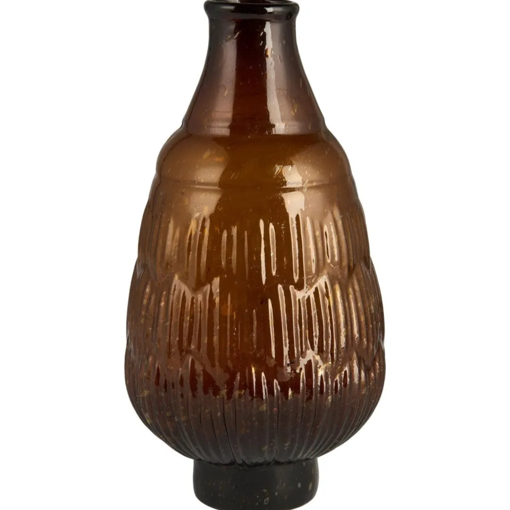 Glas. Glasvase mit schrägem Hals und schmalem Fuß aus mundgeblasenem Glas. Die Vase ist mit einem schlichten Muster verziert, das direkt in das Glas geprägt ist und ihr ein elegantes Aussehen verleiht.