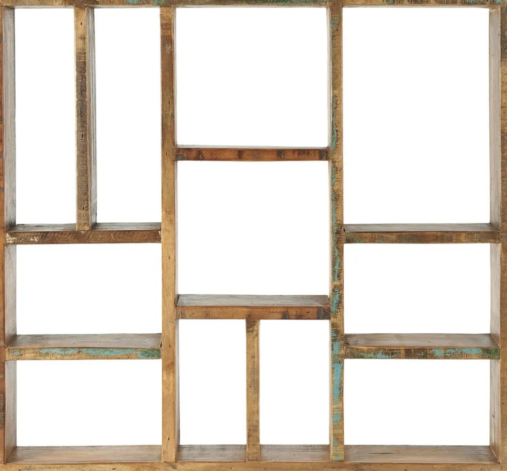 Das Wandregal ist in Indien aus Recyclingholz von Abbruchmaterial hergestellt. Das Holz hat Knorren, Risse, Sprünge und Splinter, und die Holzart variiert. Das Regal ist horizontal und vertikal aufhängbar.